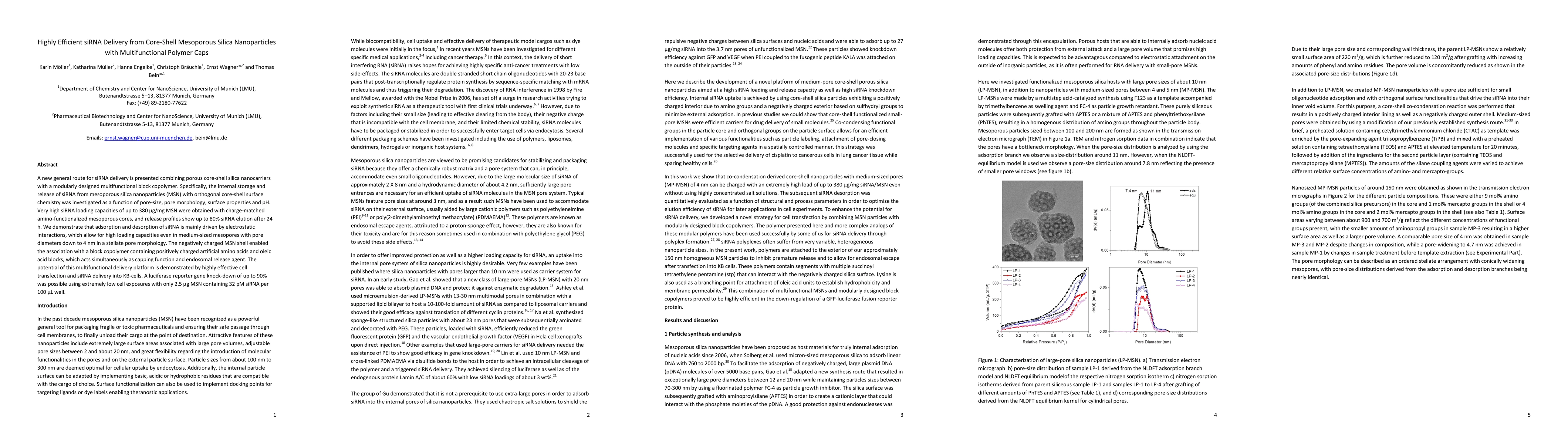This paper presents a highly efficient siRNA delivery system using core-shell mesoporous silica nanoparticles capped with a multifunctional polymer. The system achieves high siRNA loading and effective release driven by electrostatic interactions, demonstrating significant gene knockdown in KB-cells with minimal exposure.