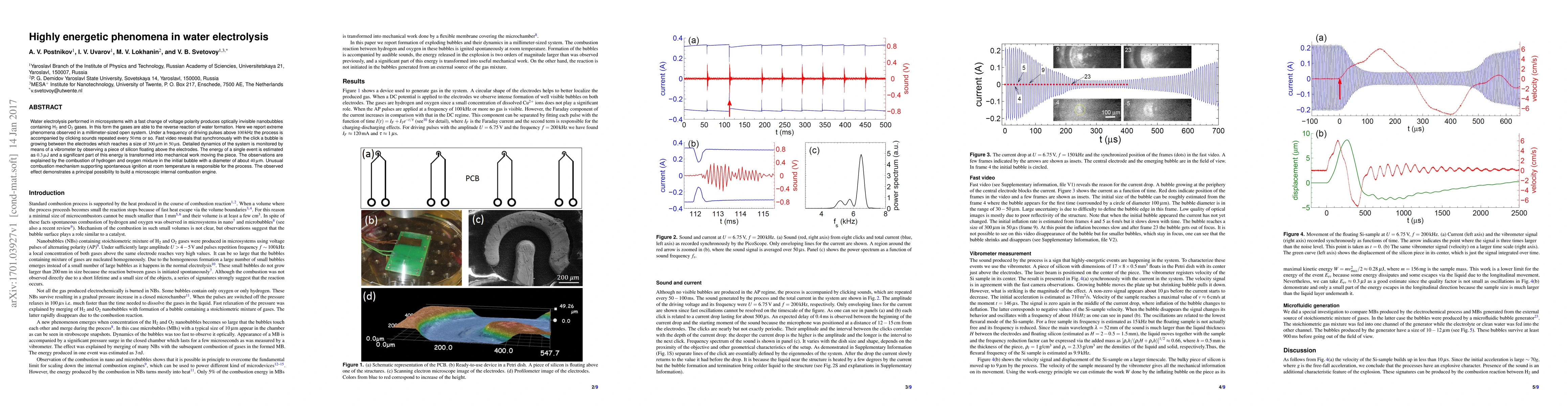 Researchers discovered a phenomenon where water electrolysis creates nanobubbles containing H2 and O2 gases that combust in mid-air, producing clicking sounds and mechanical motion. This effect, which could enable microscopic internal combustion engines, occurs at frequencies above 100 kHz with energy release of up to 0.3 uJ.