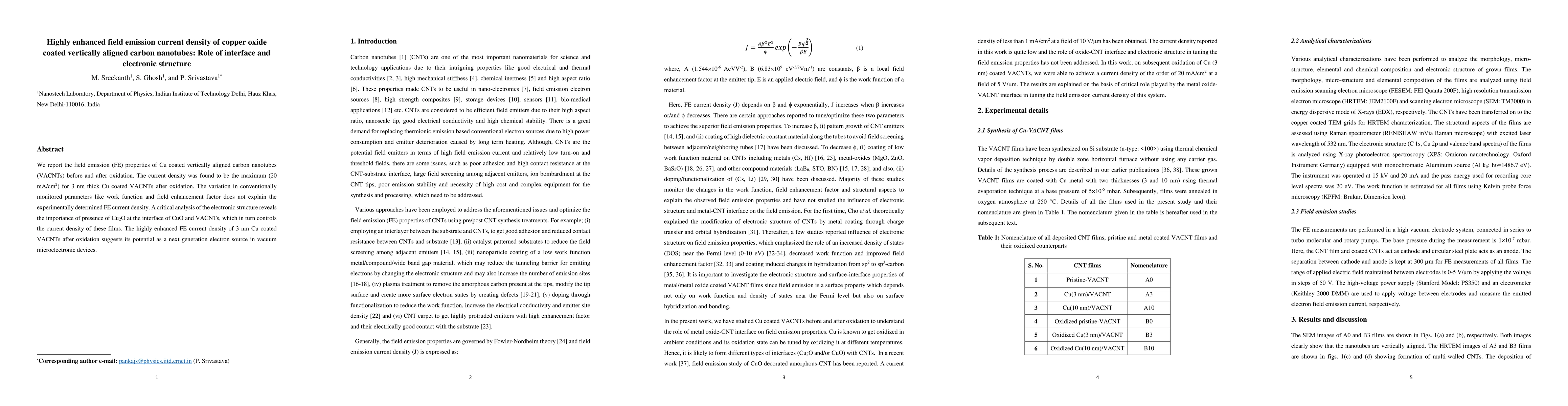 We report the field emission (FE) properties of Cu coated vertically aligned carbon nanotubes (VACNTs) before and after oxidation. The current density was found to be the maximum (20 mA/cm$^2$) for 3 nm thick Cu coated VACNTs after oxidation. The variation in conventionally monitored parameters like work function and field enhancement factor does not explain the experimentally determined FE current density. A critical analysis of the electronic structure reveals the importance of presence of Cu$_2$O at the interface of CuO and VACNTs, which in turn controls the current density of these films. The highly enhanced FE current density of 3 nm Cu coated VACNTs after oxidation suggests its potential as a next generation electron source in vacuum microelectronic devices.