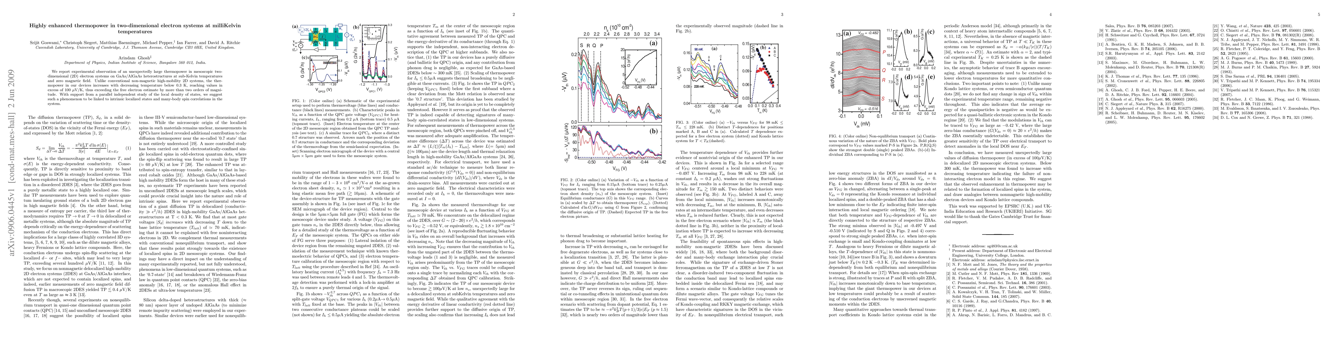This paper reports an unexpectedly large thermopower in mesoscopic two-dimensional electron systems on GaAs/AlGaAs heterostructures, exceeding conventional estimates by two orders of magnitude at milliKelvin temperatures. The observed enhancement is attributed to intrinsic localized states and many-body spin correlations, rather than conventional mechanisms.