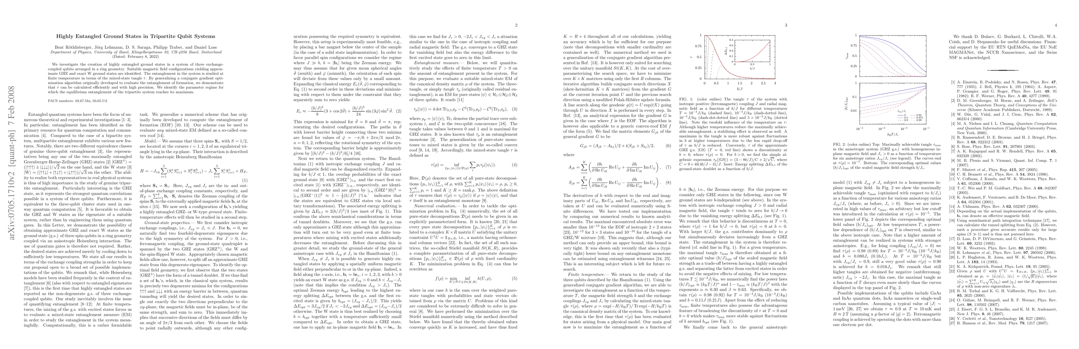 Researchers investigated highly entangled states in a system of three exchange-coupled qubits and found conditions for achieving approximate GHZ and exact W ground states, with maximum equilibrium entanglement occurring at specific temperature regimes.