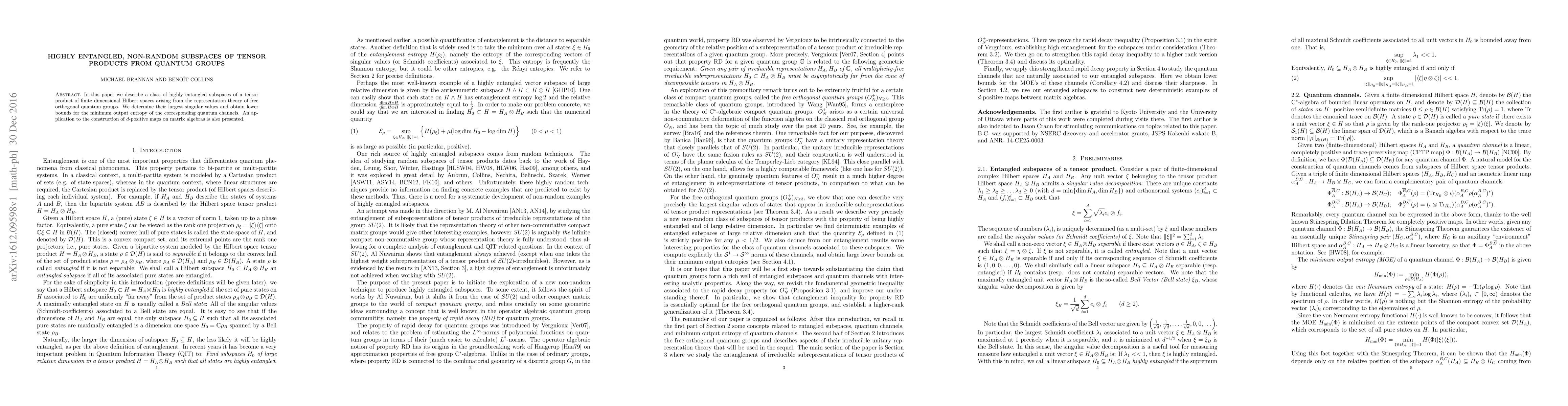 In this paper we describe a class of highly entangled subspaces of a tensor product of finite dimensional Hilbert spaces arising from the representation theory of free orthogonal quantum groups. We determine their largest singular values and obtain lower bounds for the minimum output entropy of the corresponding quantum channels. An application to the construction of $d$-positive maps on matrix algebras is also presented.