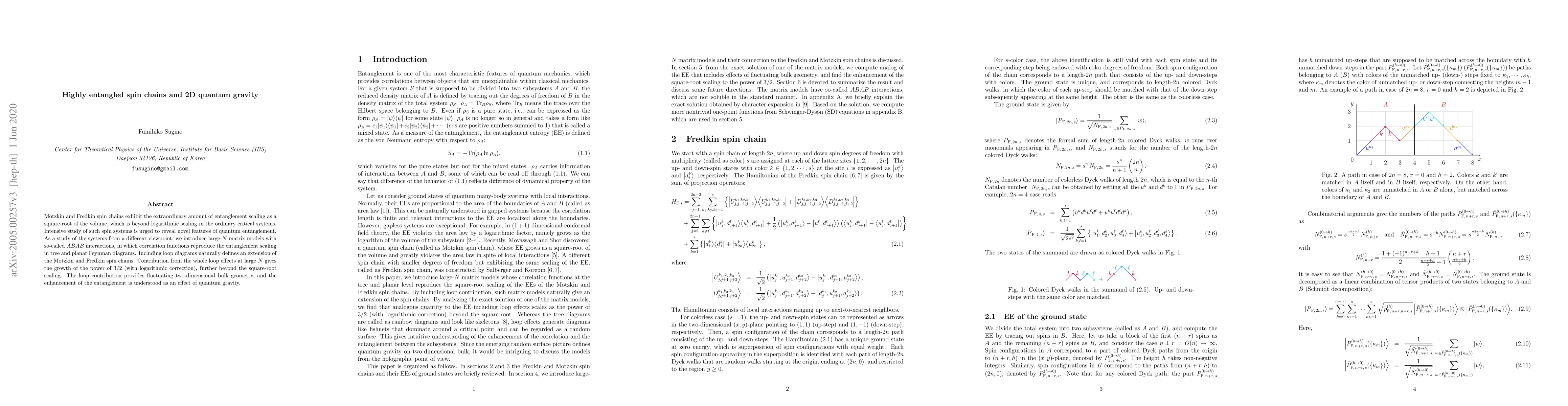 This paper investigates highly entangled spin chains, specifically Motzkin and Fredkin spin chains, which exhibit entanglement scaling beyond the logarithmic growth typical of critical systems. The study introduces large-N matrix models with ABAB interactions to explore these systems and finds that loop diagrams extend the entanglement scaling, suggesting a connection to 2D quantum gravity.