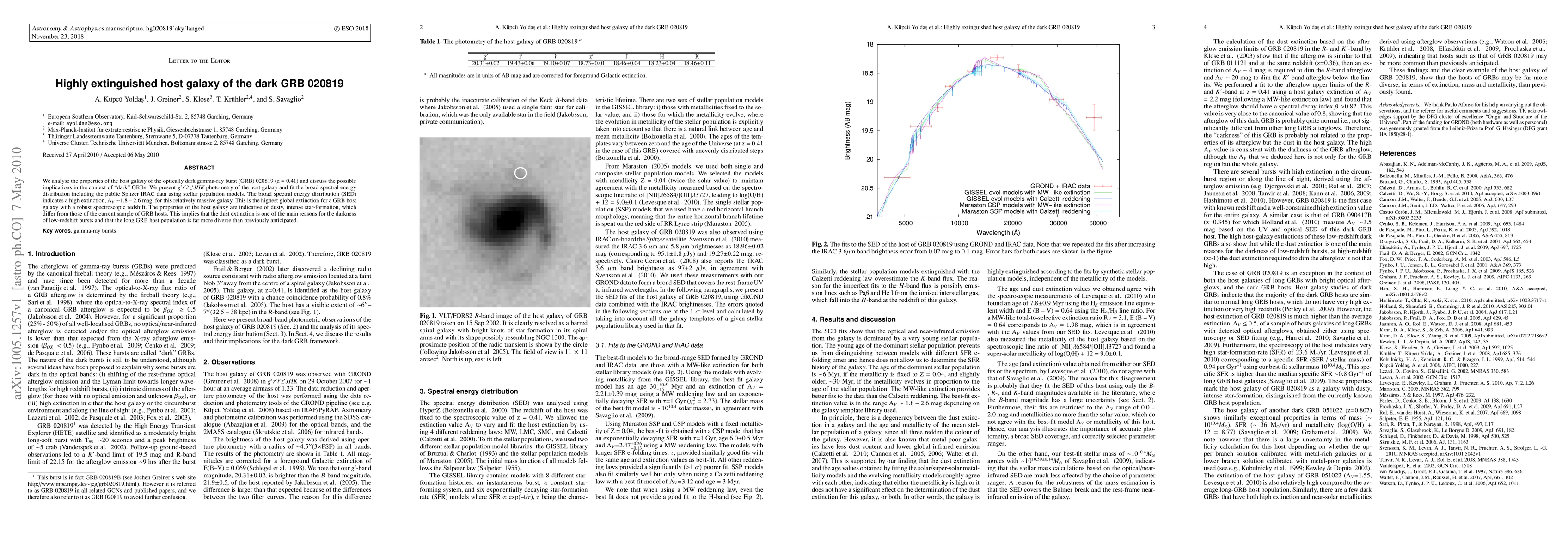 This study analyzes the highly extinguished host galaxy of the dark GRB 020819, revealing significant dust extinction and intense star formation, suggesting a diverse long GRB host population and that dust plays a major role in the darkness of low-redshift bursts.
