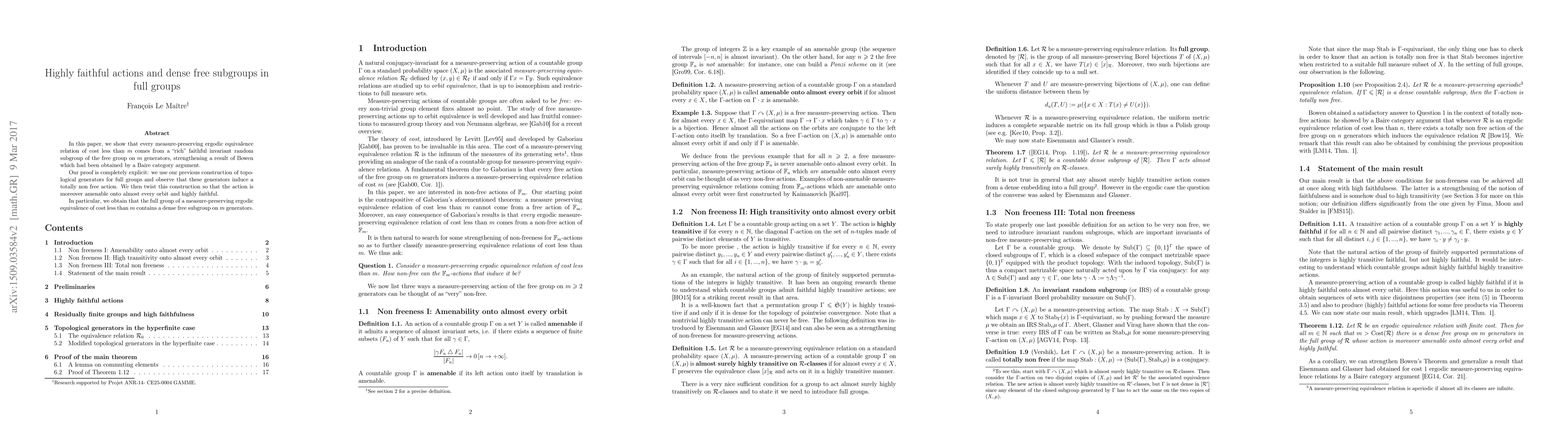 In this paper, we show that every measure-preserving ergodic equivalence relation of cost less than m comes from a "rich" faithful invariant random subgroup of the free group on m generators, strengthening a result of Bowen which had been obtained by a Baire category argument. Our proof is completely explicit: we use our previous construction of topological generators for full groups and observe that these generators induce a totally non free action. We then twist this construction so that the action is moreover amenable onto almost every orbit and highly faithful.