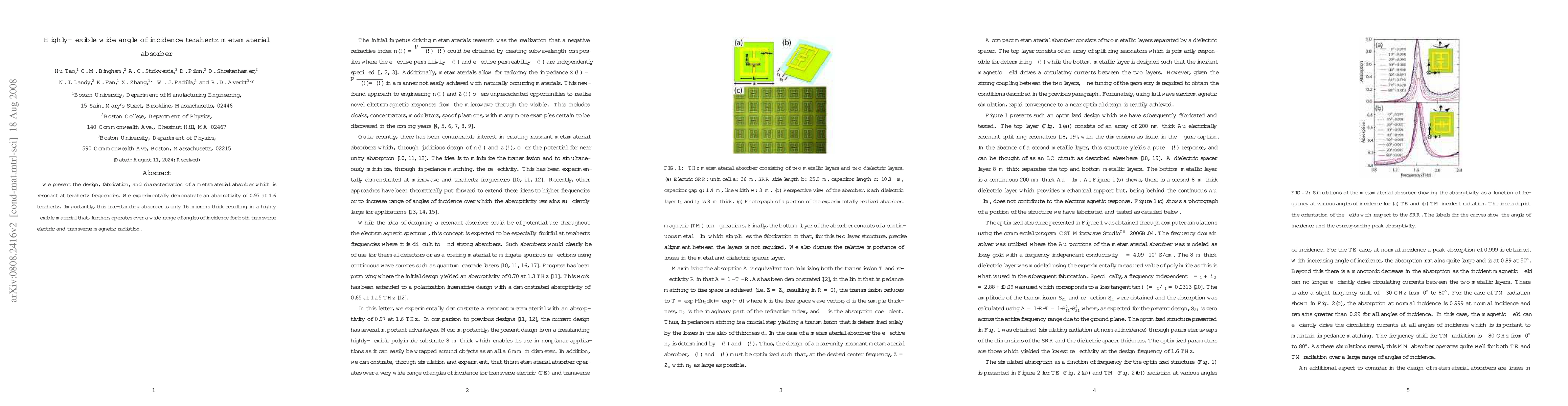 This paper details a highly flexible, thin metamaterial absorber that achieves 97% absorptivity at 1.6 terahertz, maintaining performance over a wide range of incidence angles for both TE and TM radiation. The absorber's 16-micron thickness makes it suitable for flexible applications.