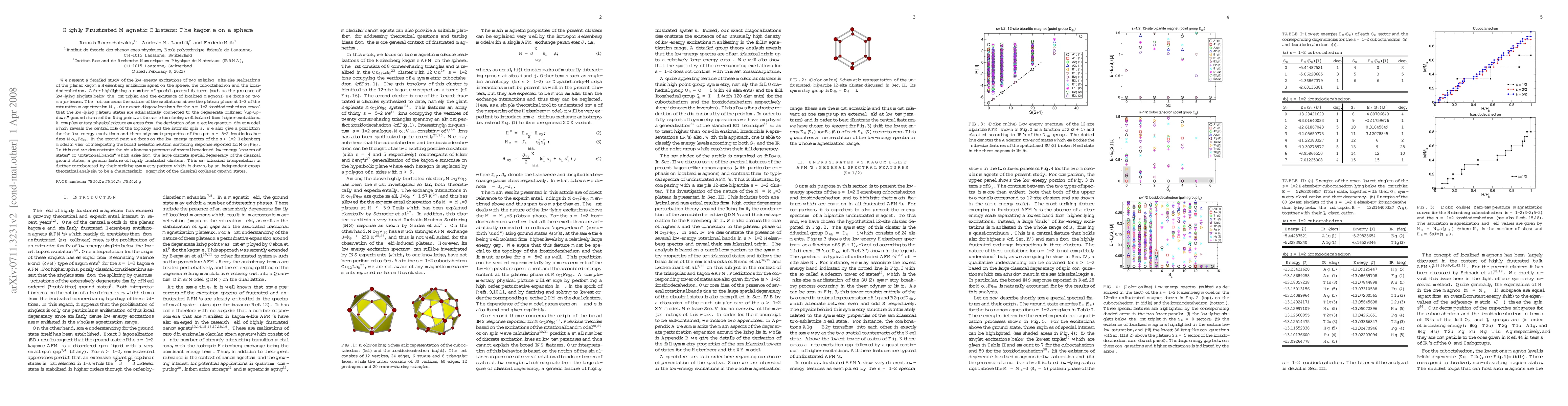 We present a detailed study of the low-energy excitations of two existing finite-size realizations of the planar kagome Heisenberg antiferromagnet on the sphere, the cuboctahedron and the icosidodecahedron. After highlighting a number of special spectral features (such as the presence of low-lying singlets below the first triplet and the existence of localized magnons) we focus on two major issues. The first concerns the nature of the excitations above the plateau phase at 1/3 of the saturation magnetization Ms. Our exact diagonalizations for the s=1/2 icosidodecahedron reveal that the low-lying plateau states are adiabatically connected to the degenerate collinear ``up-up-down'' ground states of the Ising point, at the same time being well isolated from higher excitations. A complementary physical picture emerges from the derivation of an effective quantum dimer model which reveals the central role of the topology and the intrinsic spin s. We also give a prediction for the low energy excitations and thermodynamic properties of the spin s=5/2 icosidodecahedron Mo72Fe30. In the second part we focus on the low-energy spectra of the s>1/2 Heisenberg model in view of interpreting the broad inelastic neutron scattering response reported for Mo72Fe30. To this end we demonstrate the simultaneous presence of several broadened low-energy ``towers of states'' or ``rotational bands'' which arise from the large discrete spatial degeneracy of the classical ground states, a generic feature of highly frustrated clusters. This semiclassical interpretation is further corroborated by their striking symmetry pattern which is shown, by an independent group theoretical analysis, to be a characteristic fingerprint of the classical coplanar ground states.