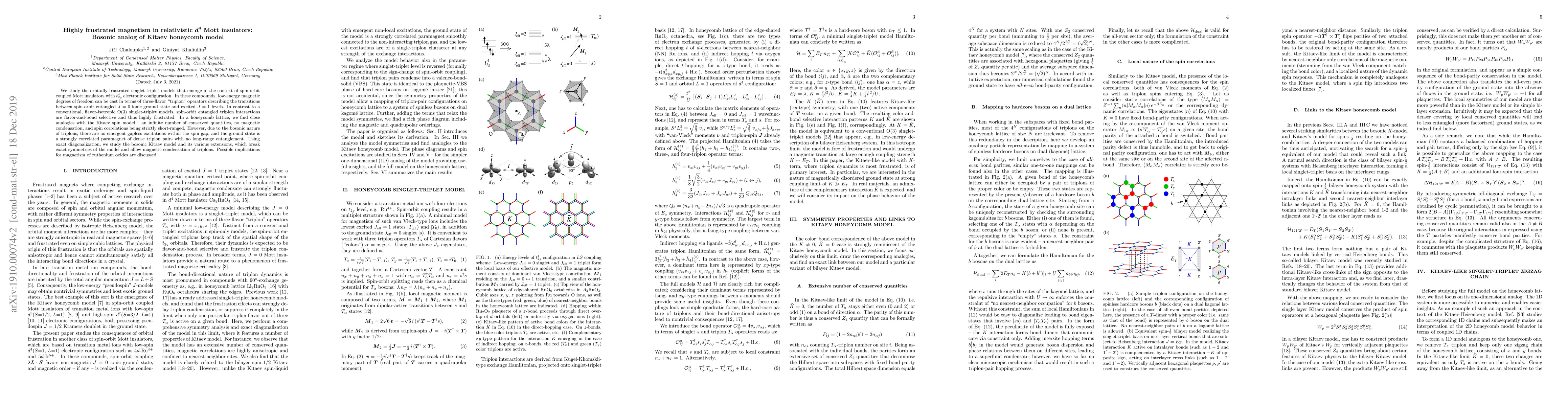 This paper investigates highly frustrated magnetism in relativistic $d^4$ Mott insulators, revealing triplon interactions analogous to the Kitaev spin model but with bosonic triplons leading to a paramagnetic ground state. Implications for magnetism in ruthenium oxides are also explored.