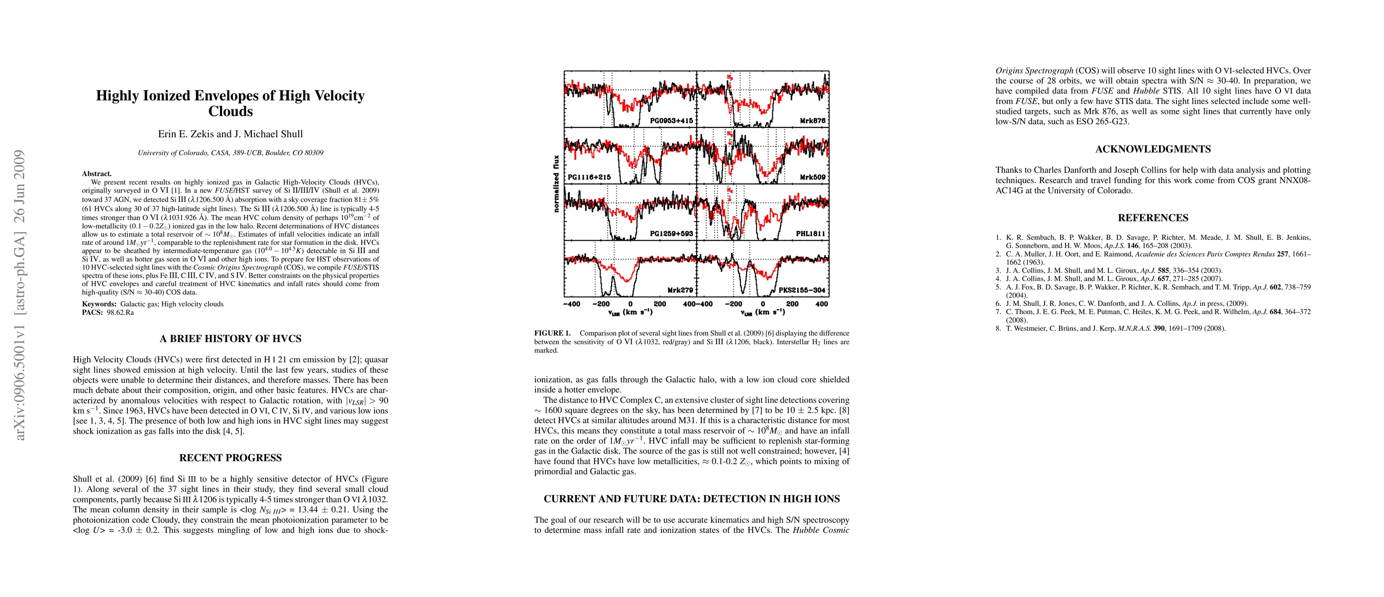We present recent results on highly ionized gas in Galactic High-Velocity Clouds (HVCs), originally surveyed in OVI (Sembach et al. 2003). In a new FUSE/HST survey of SiII/III/IV (Shull et al. 2009) toward 37 AGN, we detected SiIII (lambda 1206.500 A) absorption with a sky coverage fraction 81 +/- 5% (61 HVCs along 30 of 37 high-latitude sight lines). The SiIII (lambda 1206.500 A) line is typically 4-5 times stronger than OVI (lambda 1031.926 A). The mean HVC column density of perhaps 10^19 cm^-2 of low-metallicity (0.1 - 0.2 Z_sun) ionized gas in the low halo. Recent determinations of HVC distances allow us to estimate a total reservoir of ~10^8 M_sun. Estimates of infall velocities indicate an infall rate of around 1 M_sun yr^-1, comparable to the replenishment rate for star formation in the disk. HVCs appear to be sheathed by intermediate-temperature gas (10^4.0 - 10^4.5 K) detectable in SiIII and SiIV, as well as hotter gas seen in OVI and other high ions. To prepare for HST observations of 10 HVC-selected sight lines with the Cosmic Origins Spectrograph (COS), we compile FUSE/STIS spectra of these ions, plus FeIII, CIII, CIV, and SIV. Better constraints on the physical properties of HVC envelopes and careful treatment of HVC kinematics and infall rates should come from high-quality (S/N ~ 30-40) COS data.
