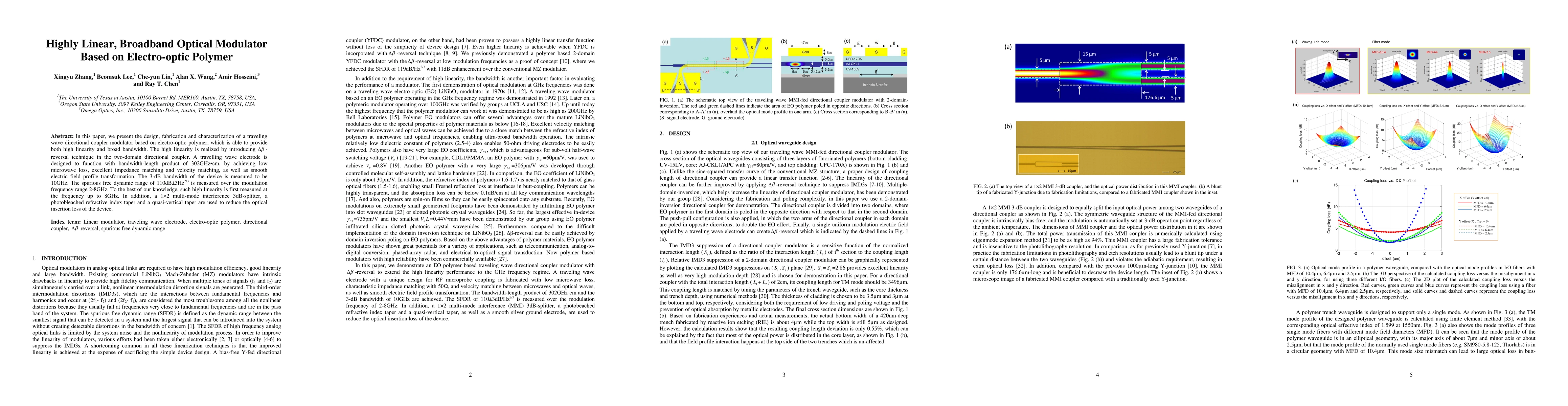 This paper details the design and fabrication of a highly linear, broadband optical modulator based on electro-optic polymer, utilizing a traveling wave directional coupler with a domain-inversion technique. The device achieves a 3-dB bandwidth of 10GHz and a spurious free dynamic range of 110dB Hz^(2/3) up to 8GHz, demonstrating high linearity and low optical insertion loss.