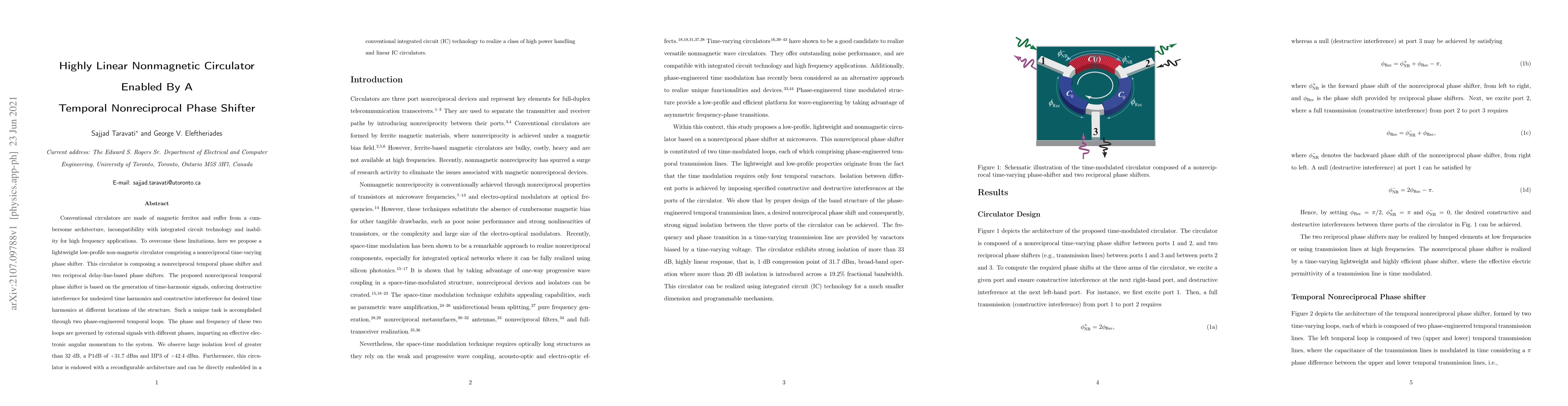 This paper proposes a highly linear, nonmagnetic circulator using a nonreciprocal temporal phase shifter, eliminating the need for magnetic ferrites and enabling high-frequency applications. The design achieves large isolation levels and is reconfigurable, suitable for integration with conventional IC technology.