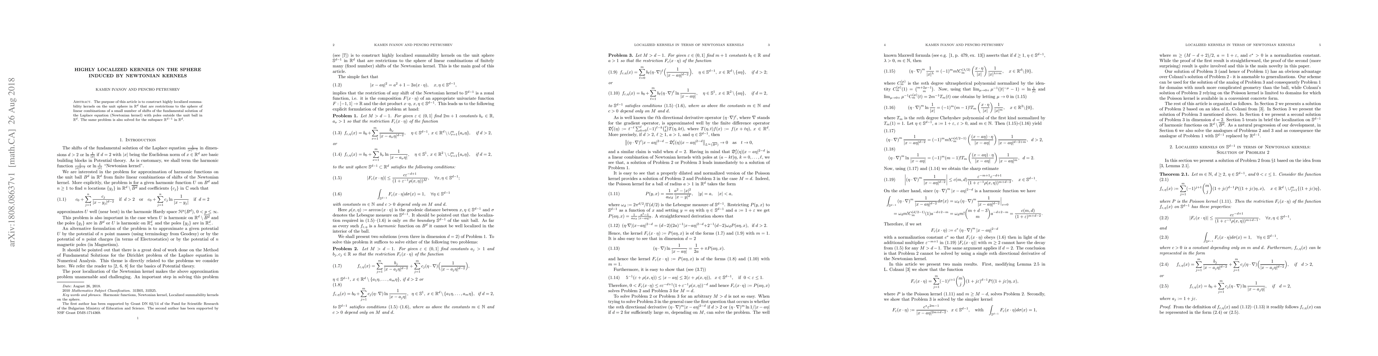 The purpose of this article is to construct highly localized summability kernels on the unit sphere in ${\mathbb R}^d$ that are restrictions to the sphere of linear combinations of a small number of shifts of the fundamental solution of the Laplace equation (Newtonian kernel) with poles outside the unit ball in ${\mathbb R}^d$. The same problem is also solved for the subspace ${\mathbb R}^{d-1}$ in ${\mathbb R}^d$.