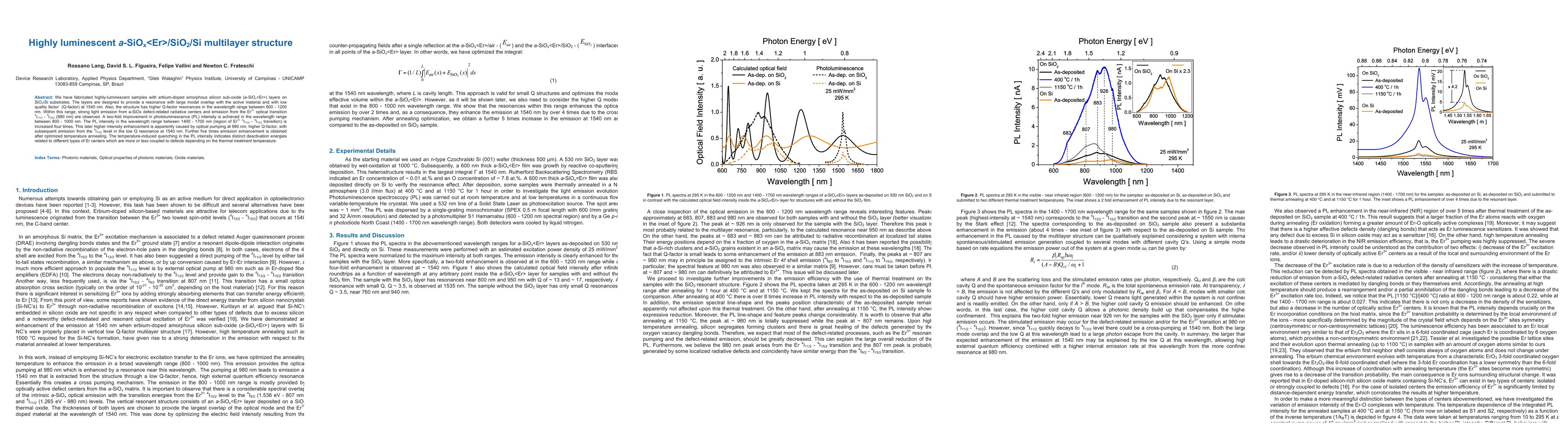 This paper reports the fabrication of highly luminescent erbium-doped amorphous silicon sub-oxide layers on SiO2/Si substrates, achieving a two-fold improvement in photoluminescence intensity in the 800-1000 nm range and a four-fold enhancement in the 1400-1700 nm range due to optical pumping and higher Q-factors, with further five-fold enhancement via optimized temperature annealing.