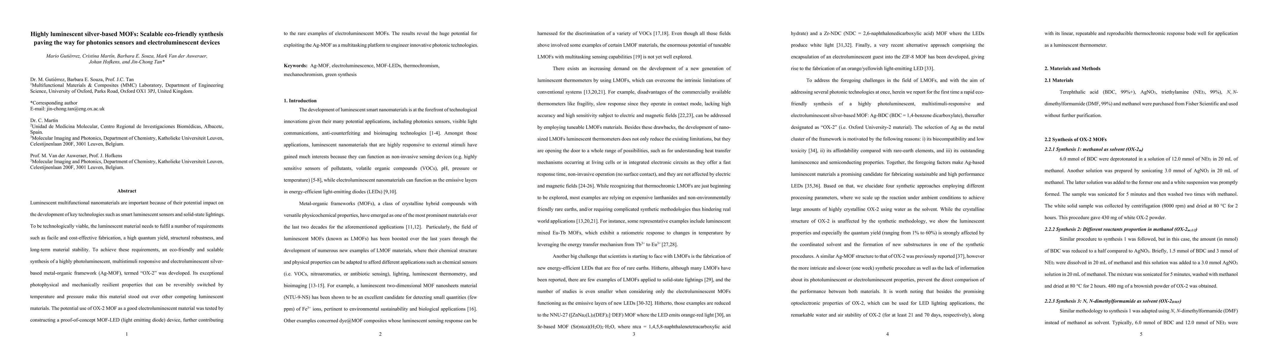 Luminescent multifunctional nanomaterials are important because of their potential impact on the development of key technologies such as smart luminescent sensors and solid-state lightings. To be technologically viable, the luminescent material needs to fulfil a number of requirements such as facile and cost-effective fabrication, a high quantum yield, structural robustness, and long-term material stability. To achieve these requirements, an eco-friendly and scalable synthesis of a highly photoluminescent, multistimuli responsive and electroluminescent silver-based metal-organic framework (Ag-MOF), termed "OX-2" was developed. Its exceptional photophysical and mechanically resilient properties that can be reversibly switched by temperature and pressure make this material stood out over other competing luminescent materials. The potential use of OX-2 MOF as a good electroluminescent material was tested by constructing a proof-of-concept MOF-LED (light emitting diode) device, further contributing to the rare examples of electroluminescent MOFs. The results reveal the huge potential for exploiting the Ag MOF as a multitasking platform to engineer innovative photonic technologies.
