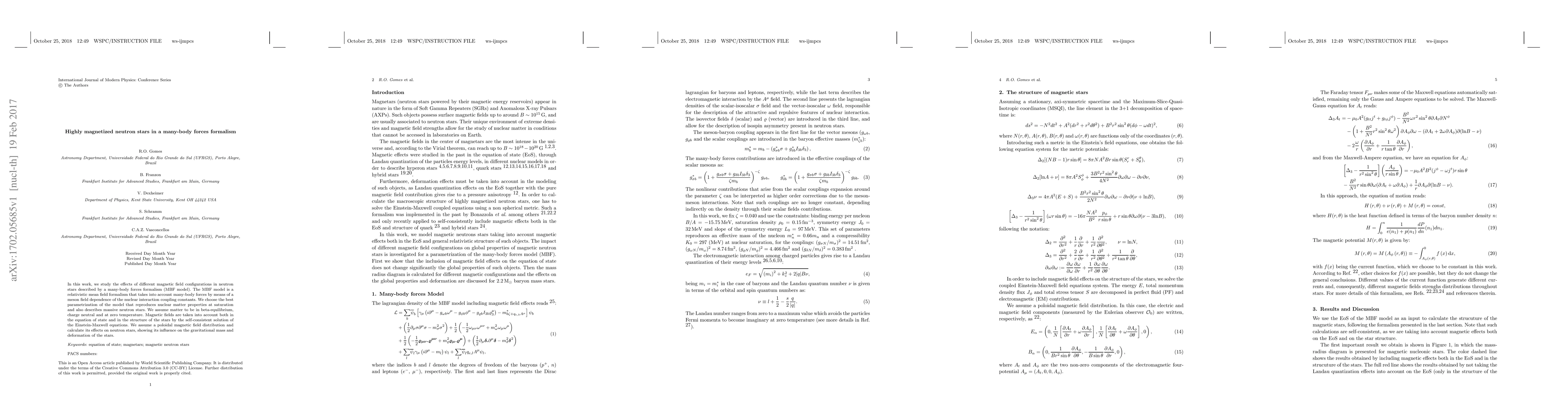 This paper investigates neutron stars' properties under various magnetic field configurations using a many-body forces formalism (MBF model), which incorporates relativistic mean field theory and many-body forces. The study finds that magnetic fields significantly affect the gravitational mass and deformation of neutron stars.