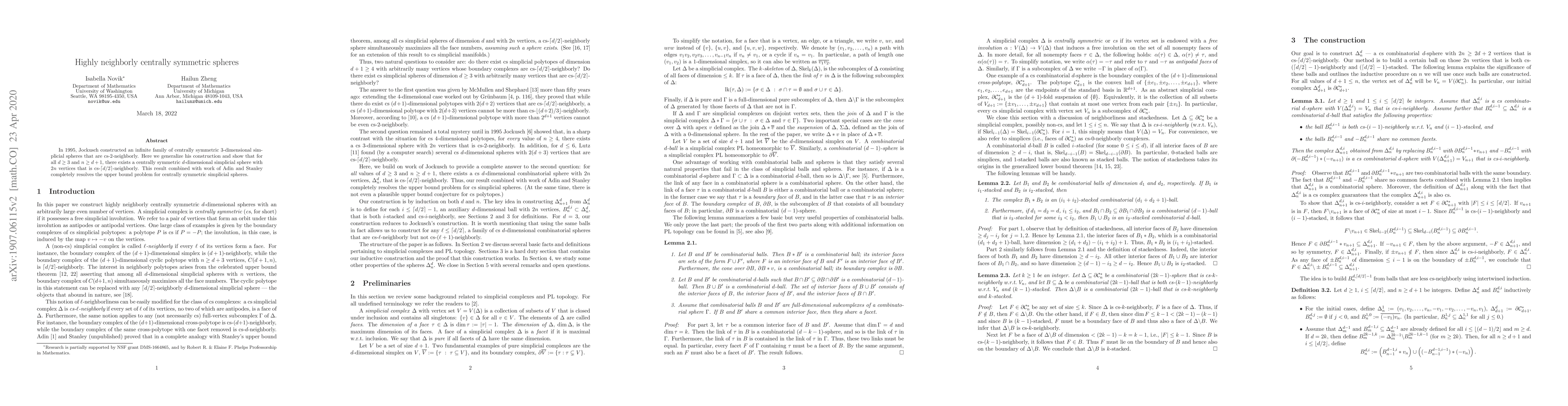 The research generalizes Jockusch's 1995 construction of centrally symmetric 3-dimensional simplicial spheres that are cs-$2$-neighborly, extending it to $d$-dimensional simplicial spheres for $d \geq 3$ and $n \geq d+1$.