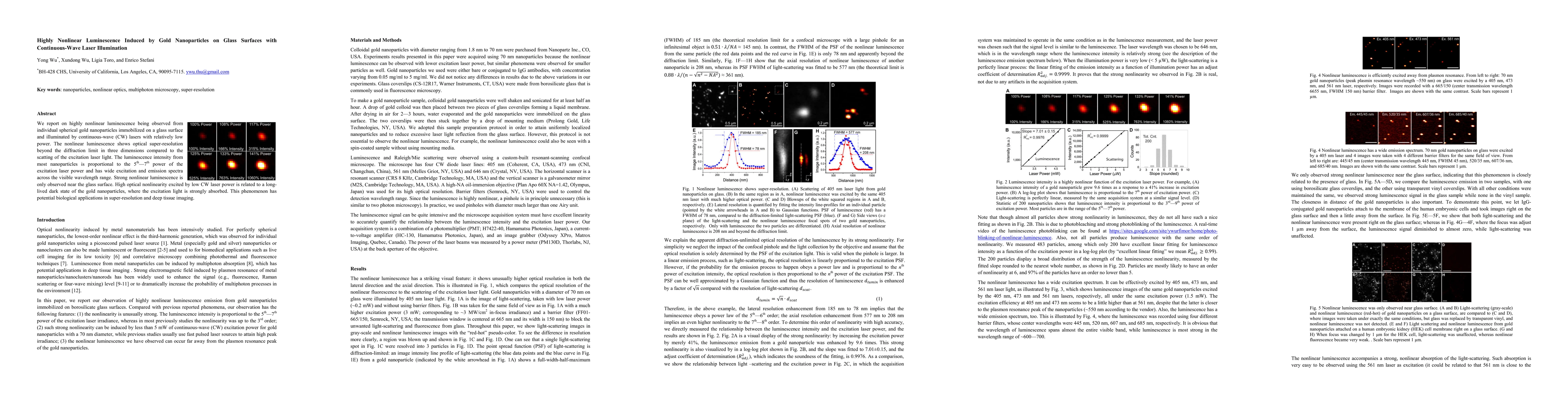 This paper reports on highly nonlinear luminescence from gold nanoparticles on glass, showing optical super-resolution and intensity proportional to high powers of excitation laser, with potential for biological imaging applications. The strong effect is observed near the glass surface due to the long-lived dark state of the nanoparticles.