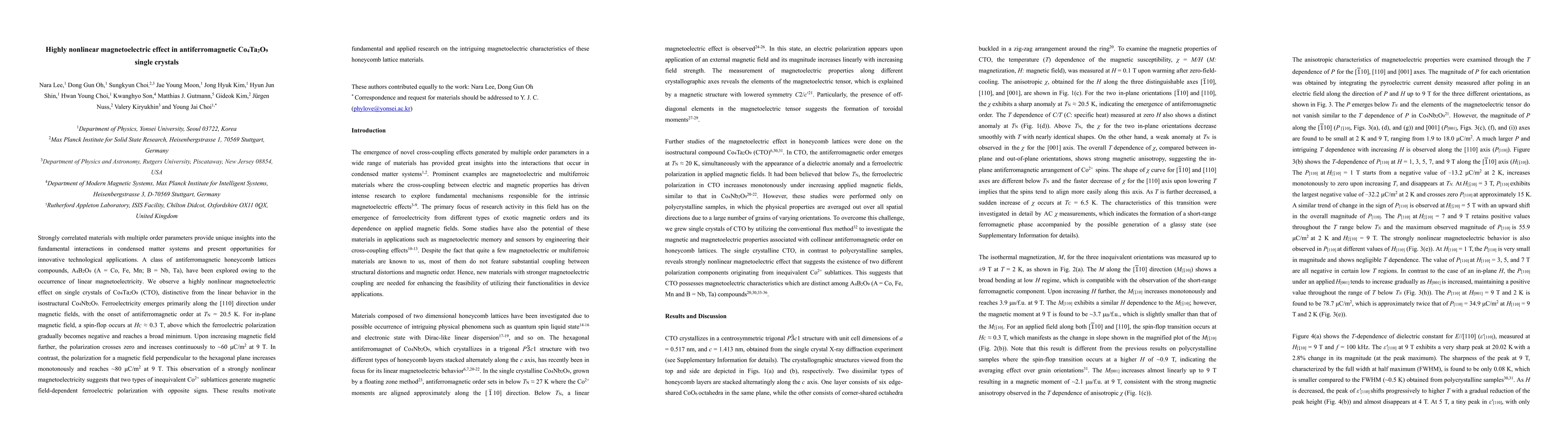 Strongly correlated materials with multiple order parameters provide unique insights into the fundamental interactions in condensed matter systems and present opportunities for innovative technological applications. A class of antiferromagnetic honeycomb lattices compounds, A4B2O9 (A = Co, Fe, Mn; B = Nb, Ta), have been explored owing to the occurrence of linear magnetoelectricity. We observe a highly nonlinear magnetoelectric effect on single crystals of Co4Ta2O9 (CTO), distinctive from the linear behavior in the isostructural Co4Nb2O9. Ferroelectricity emerges primarily along the [110] direction under magnetic fields, with the onset of antiferromagnetic order at TN = 20.5 K. For in-plane magnetic field, a spin-flop occurs at HC ~ 0.3 T, above which the ferroelectric polarization gradually becomes negative and reaches a broad minimum. Upon increasing magnetic field further, the polarization crosses zero and increases continuously to ~60 uC/m2 at 9 T. In contrast, the polarization for a magnetic field perpendicular to the hexagonal plane increases monotonously and reaches ~80 uC/m2 at 9 T. This observation of a strongly nonlinear magnetoelectricity suggests that two types of inequivalent Co2+ sublattices generate magnetic field-dependent ferroelectric polarization with opposite signs. These results motivate fundamental and applied research on the intriguing magnetoelectric characteristics of these honeycomb lattice materials.