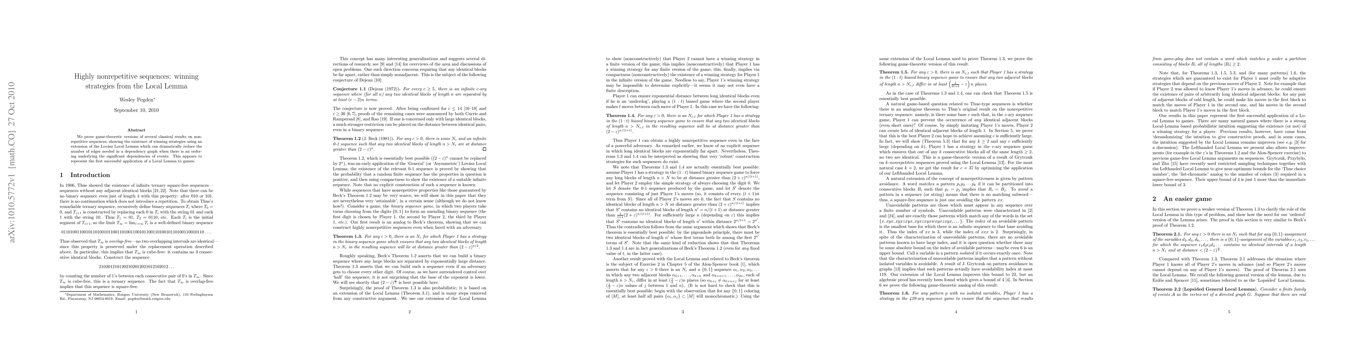 The paper proves game-theoretic interpretations of nonrepetitive sequence results, demonstrating winning strategies via a Local Lemma extension. This method significantly reduces dependency graph edges, marking a potential first application of Local Lemma to games.