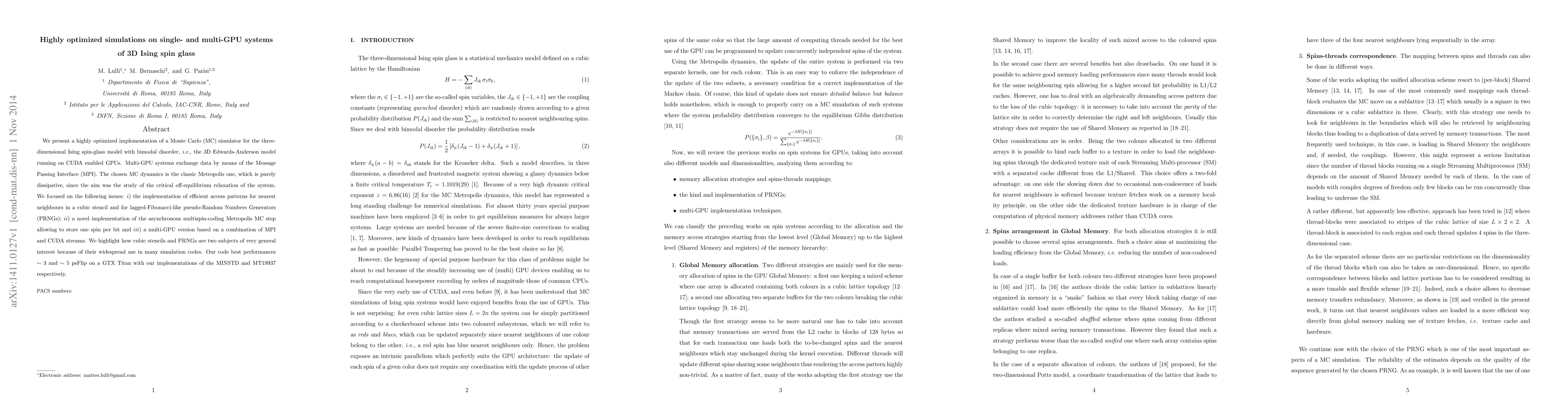 Researchers developed a highly optimized simulation for the 3D Ising spin-glass model on single- and multi-GPU systems, achieving performance gains of ~3 psFlip on a GTX Titan.
