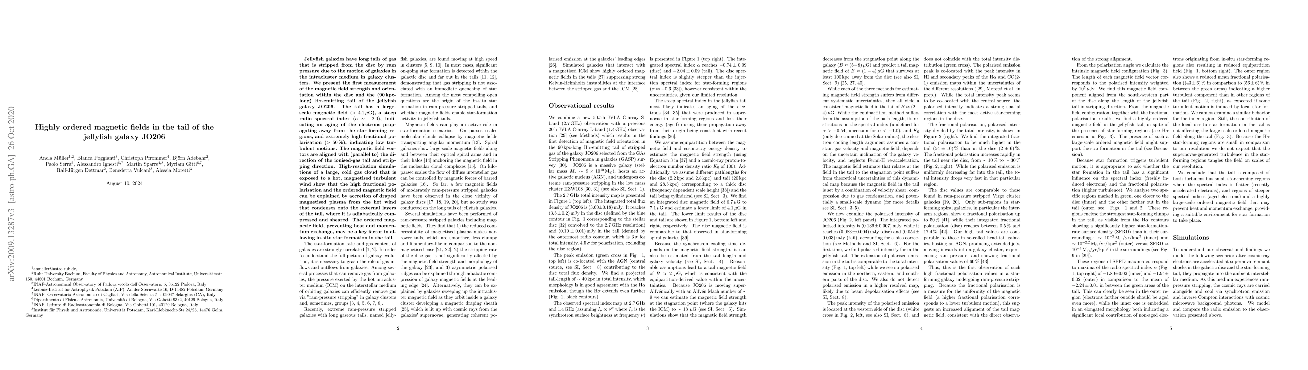 This study measures the magnetic field strength and orientation in the jellyfish galaxy JO206, revealing a large-scale ordered magnetic field in the tail, high fractional polarisation, and alignment with the ionised-gas tail. Simulations suggest this order is due to accretion of magnetised plasma from the surrounding medium.