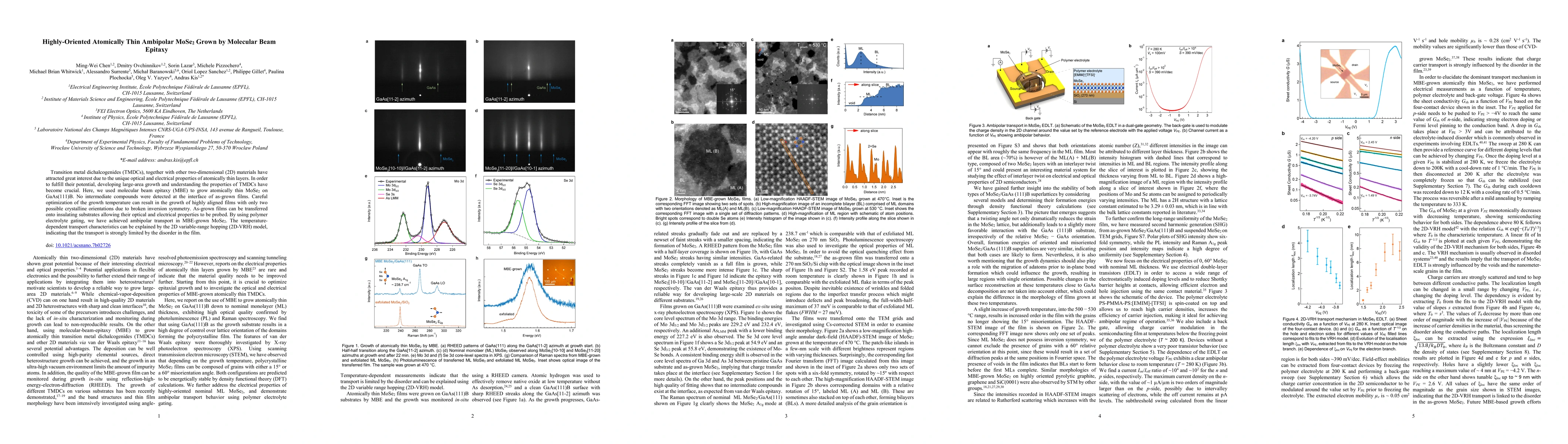 This paper reports the growth of highly-oriented, ambipolar MoSe$_2$ films using molecular beam epitaxy on GaAs(111)B substrates, achieving large-area, atomically thin layers with unique electrical transport properties explained by 2D variable-range hopping. The films display ambipolar transport when transferred onto insulating substrates and exhibit minimal disorder.