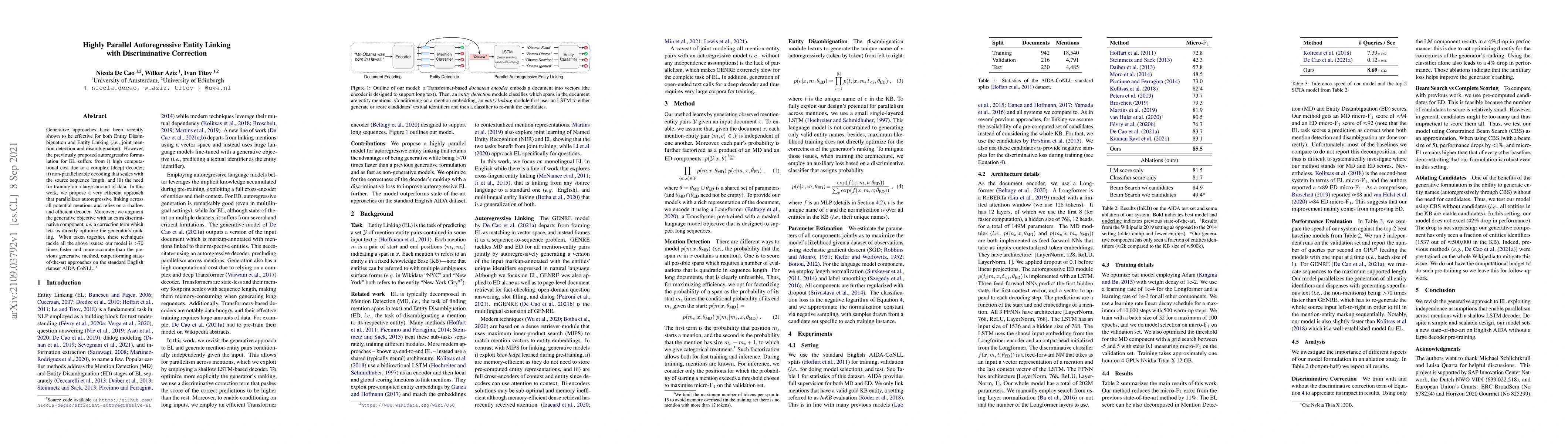 This paper presents an efficient parallel autoregressive model for Entity Linking that addresses computational cost, non-parallelizability, and data dependency issues. It introduces a shallow decoder and a discriminative correction term, resulting in a model that is over 70 times faster and more accurate than previous methods.
