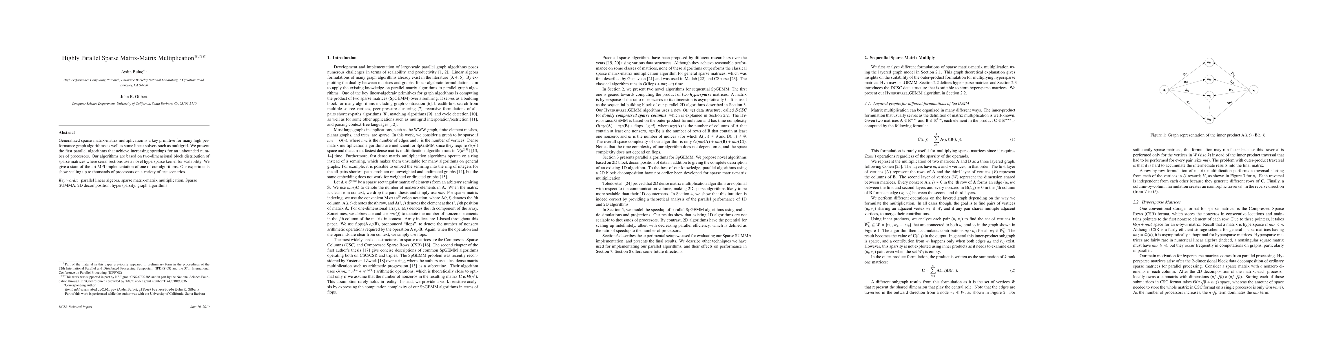 This paper introduces parallel algorithms for sparse matrix-matrix multiplication, achieving significant speedups with an increasing number of processors. The algorithms utilize a two-dimensional block distribution and a novel hypersparse kernel, demonstrated through a state-of-the-art MPI implementation, showing scalability up to thousands of processors.