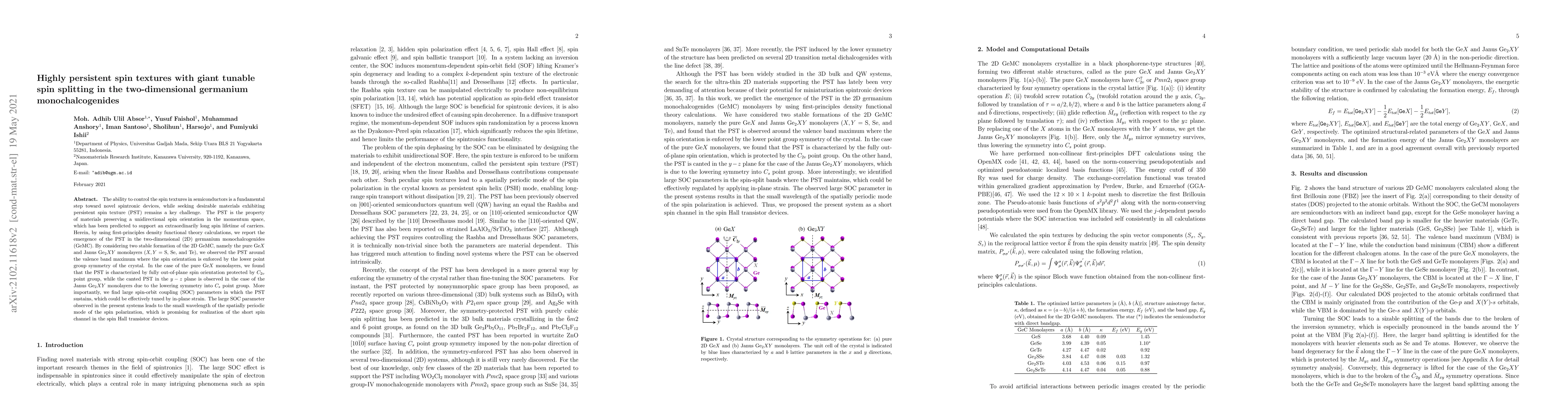 This study reveals persistent spin textures in two-dimensional germanium monochalcogenides (GeMC) using density functional theory, characterized by long spin lifetimes. The PST can be tuned by in-plane strain, offering potential for advanced spintronic devices.