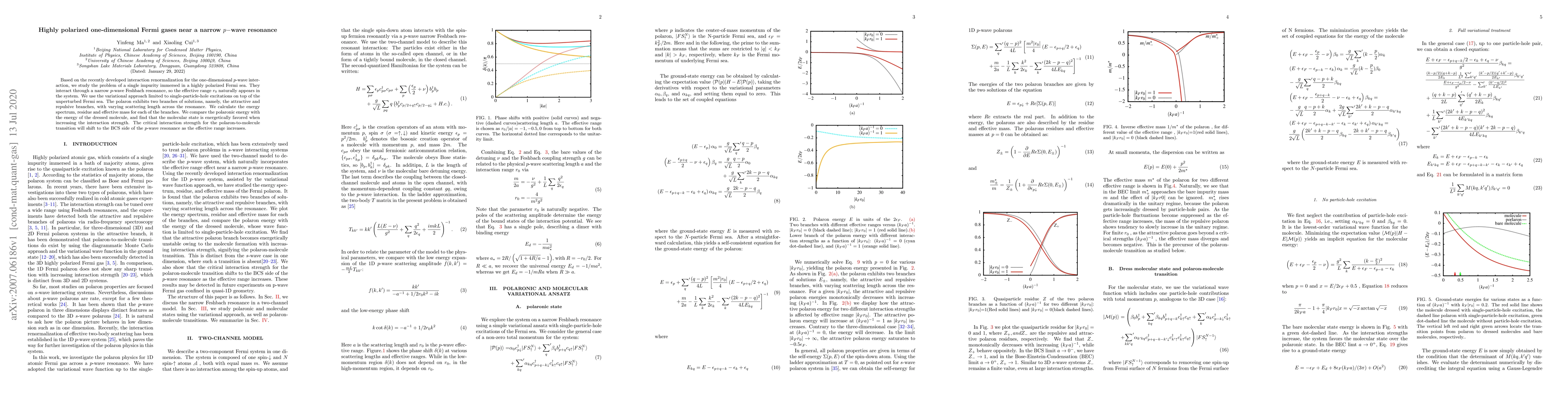 Based on the recently developed interaction renormalization for the one-dimensional $p$-wave interaction, we study the problem of a single impurity immersed in a highly polarized Fermi sea. They interact through a narrow $p$-wave Feshbach resonance, so the effective range $r_{0}$ naturally appears in the system. We use the variational approach limited to single-particle-hole excitations on top of the unperturbed Fermi sea. The polaron exhibits two branches of solutions, namely, the attractive and repulsive branches, with varying scattering length across the resonance. We calculate the energy spectrum, residue and effective mass for each of the branches. We compare the polaronic energy with the energy of the dressed molecule, and find that the molecular state is energetically favored when increasing the interaction strength. The critical interaction strength for the polaron-to-molecule transition will shift to the BCS side of the $p$-wave resonance as the effective range increases.