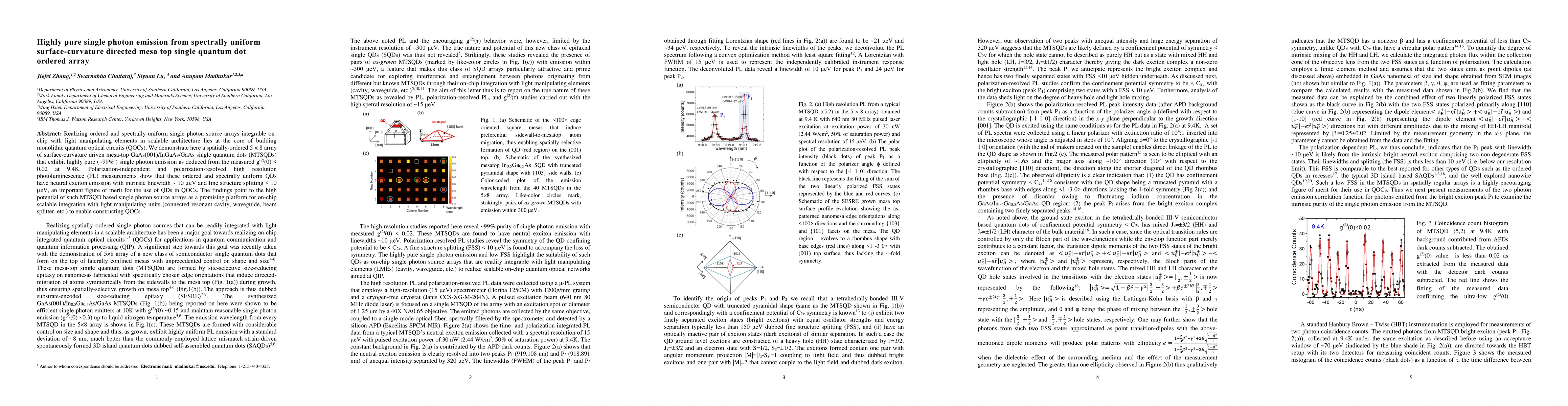 Realizing ordered and spectrally uniform single photon source arrays integrable on-chip with light manipulating elements in scalable architecture lies at the core of building monolithic quantum optical circuits (QOCs). We demonstrate here a spatially-ordered 5 x 8 array of surface-curvature driven mesa-top GaAs(001)/InGaAs/GaAs single quantum dots (MTSQDs) that exhibit highly pure (~99% ) single photon emission as deduced from the measured g(2)(0) < 0.02 at 9.4K. Polarization-independent and polarization-resolved high resolution photoluminescence (PL) measurements show that these ordered and spectrally uniform QDs have neutral exciton emission with intrinsic linewidth ~ 10 ueV and fine structure splitting < 10 ueV, an important figure of merit for the use of QDs in QOCs. The findings point to the high potential of such MTSQD based single photon source arrays as a promising platform for on-chip scalable integration with light manipulating units (connected resonant cavity, waveguide, beam splitter, etc.) to enable constructing QOCs.