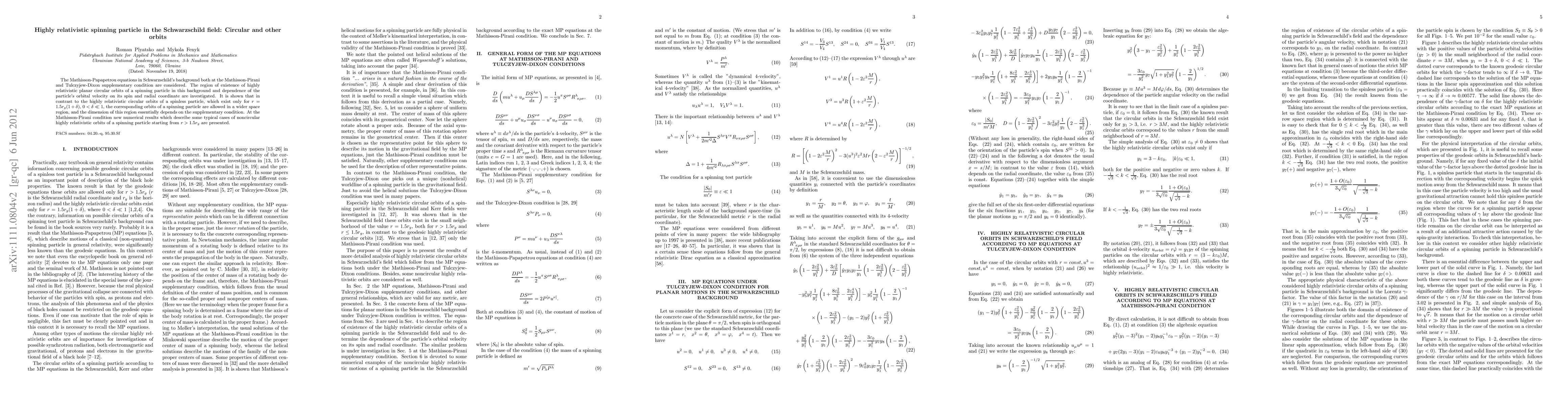 The Mathisson-Papapetrou equations in the Schwarzschild background both at Mathisson-Pirani and Tulczyjew-Dixon supplementary condition are considered. The region of existence of highly relativistic circular orbits of a spinning particle in this background and dependence of the particle's orbital velocity on its spin and radial coordinate are investigated. It is shown that in contrast to the highly relativistic circular orbits of a spinless particle, which exist only for $r=1.5 r_g(1+\delta)$, $0<\delta \ll 1$, the corresponding orbits of a spinning particle are allowed in a wider space region, and the dimension of this region significantly depends on the supplementary condition. At the Mathisson-Pirani condition new numerical results which describe some typical cases of non-circular highly relativistic orbits of a spinning particle starting from $r>1.5 r_g$ are presented.