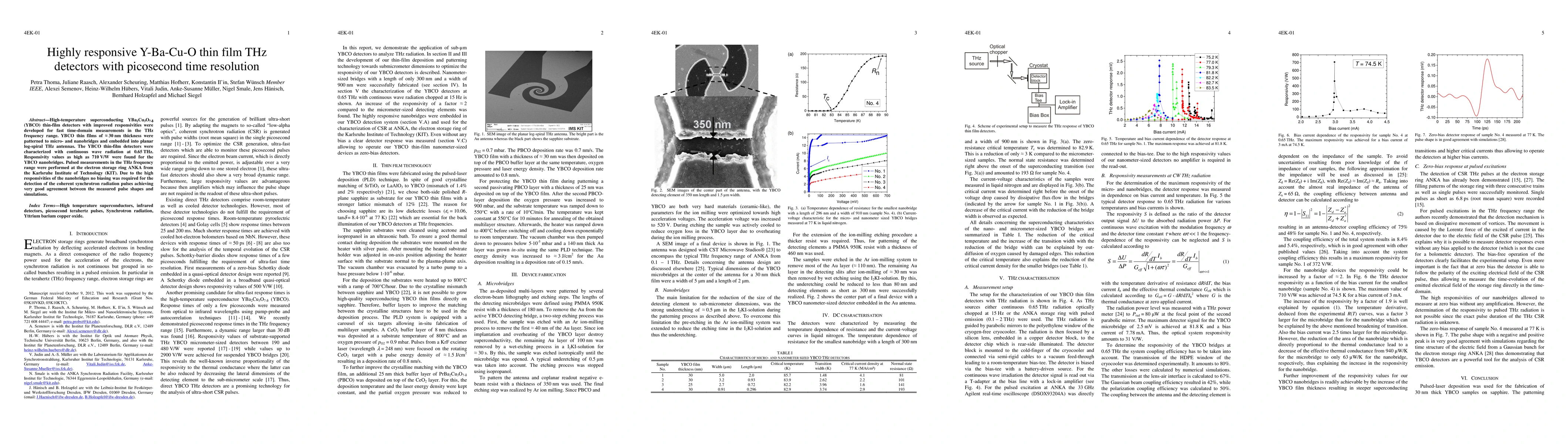 Researchers developed ultra-responsive YBa2Cu3O7-d thin films for THz detectors with picosecond time resolution, achieving high responsivities of up to 710 V/W.