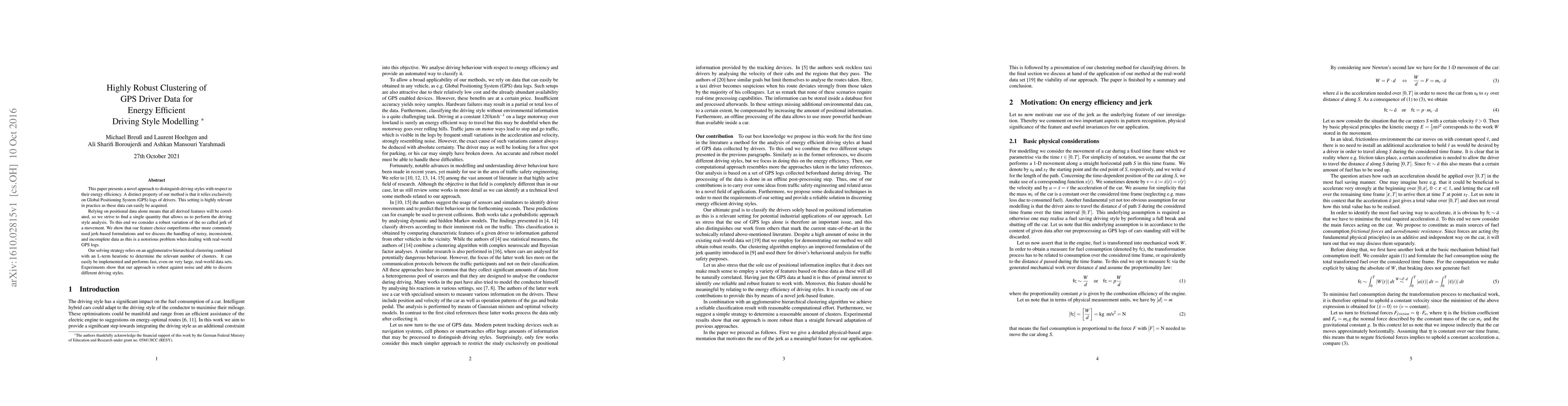 A novel approach to clustering GPS driver data for energy-efficient driving uses a robust jerk feature, performing well even with noisy and incomplete data. The method combines agglomerative hierarchical clustering with an L-term heuristic to efficiently identify distinct driving styles.