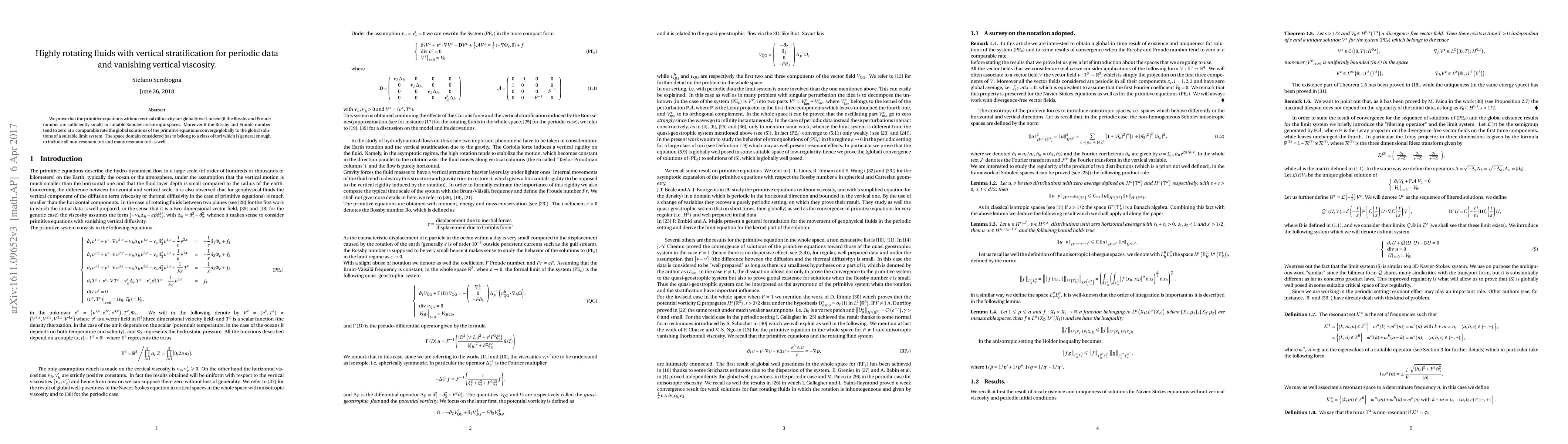 We prove that the primitive equations without vertical diffusivity are globally well-posed (if the Rossby and Froude number are sufficiently small) in suitable Sobolev anisotropic spaces. Moreover if the Rossby and Froude number tend to zero at a comparable rate the global solutions of the primitive equations converge globally to the global solutions of a suitable limit system. The space domain considered has to belong to a class of tori which is general enough to include all non-resonant tori and many resonant tori as well.