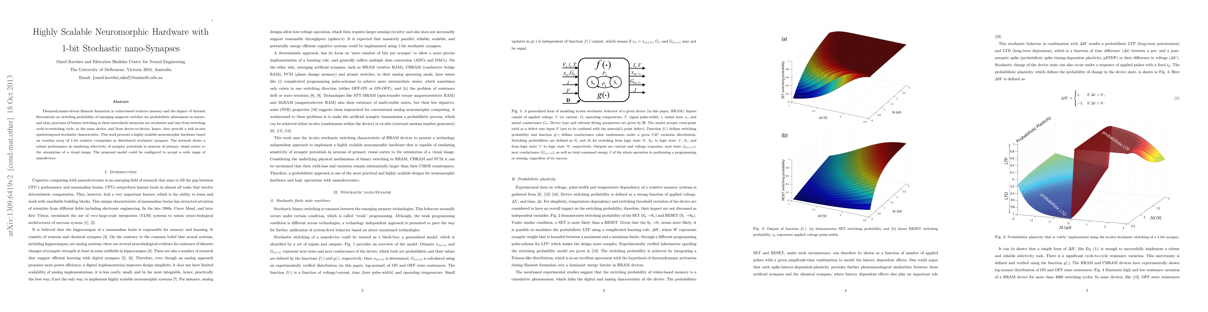 This paper introduces a scalable neuromorphic hardware system utilizing a crossbar array of 1-bit stochastic nano-synapses based on resistive memory, demonstrating robust performance in emulating neural selectivity in the primary visual cortex. The system leverages the probabilistic nature of filament formation in redox-based resistive memory and thermal fluctuations in magnetic switches.