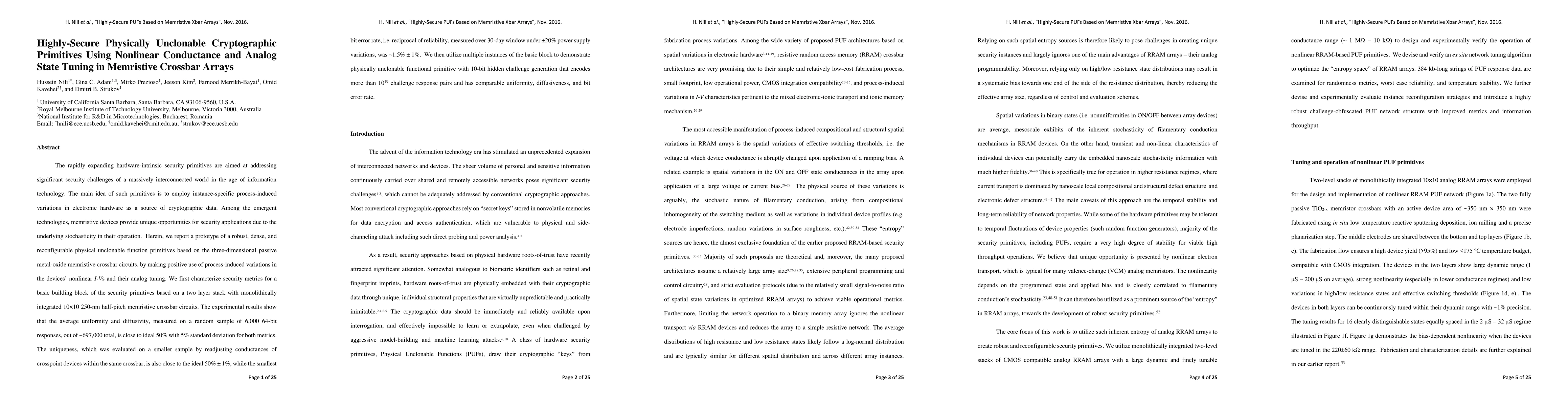 This paper presents a prototype for highly secure cryptographic primitives using nonlinear conductance and analog tuning in memristive crossbar arrays. The study demonstrates robust, dense, and reconfigurable physical unclonable functions based on 3D metal-oxide memristive circuits, achieving high uniformity, diffusivity, and low bit error rates, thus offering strong hardware-intrinsic security.