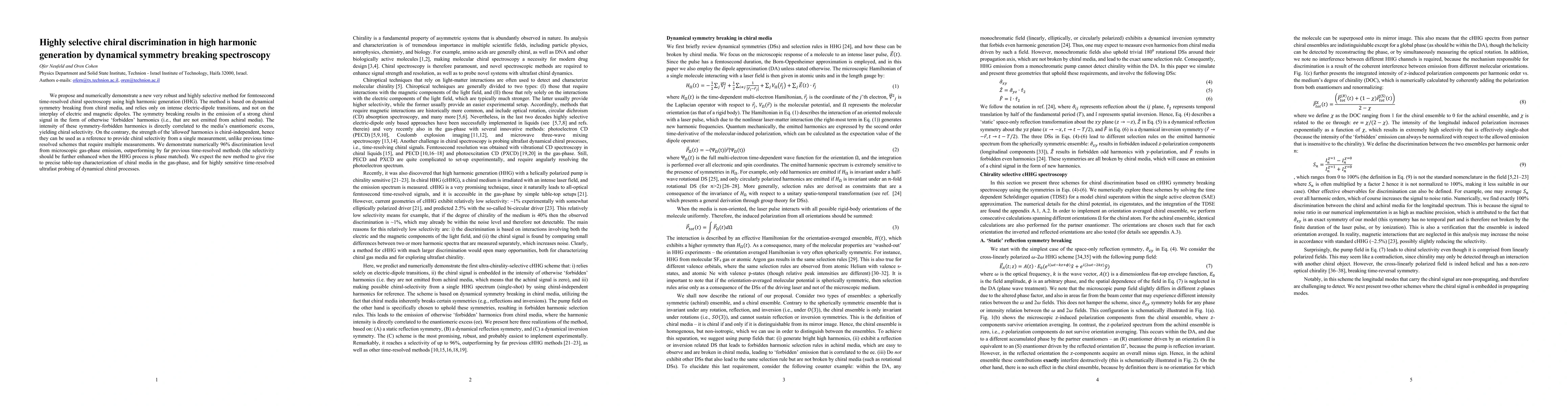 This paper proposes a novel method for highly selective chiral discrimination using high harmonic generation (HHG) based on dynamical symmetry breaking from chiral media, achieving 96% discrimination level from gas-phase emissions. The method relies on 'forbidden' harmonics that correlate with enantiomeric excess, providing a single measurement reference for chiral selectivity.
