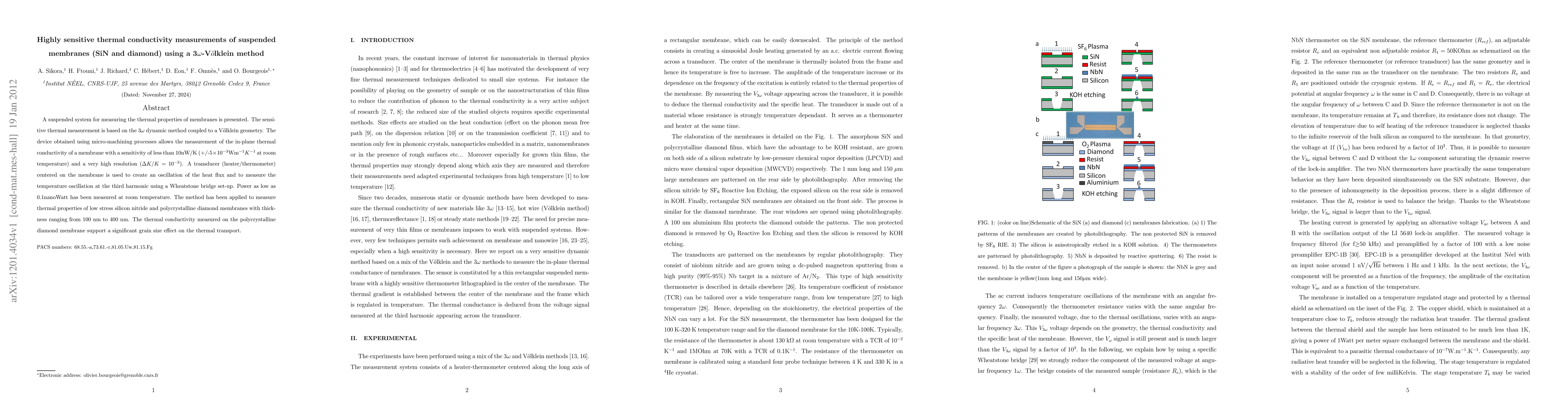 This paper presents a highly sensitive method for measuring the thermal conductivity of suspended membranes using a 3ω-Volklein technique, achieving a sensitivity of less than 10nW/K and a resolution of 0.1%. The method was applied to silicon nitride and polycrystalline diamond membranes, revealing a significant grain size effect on diamond's thermal transport.