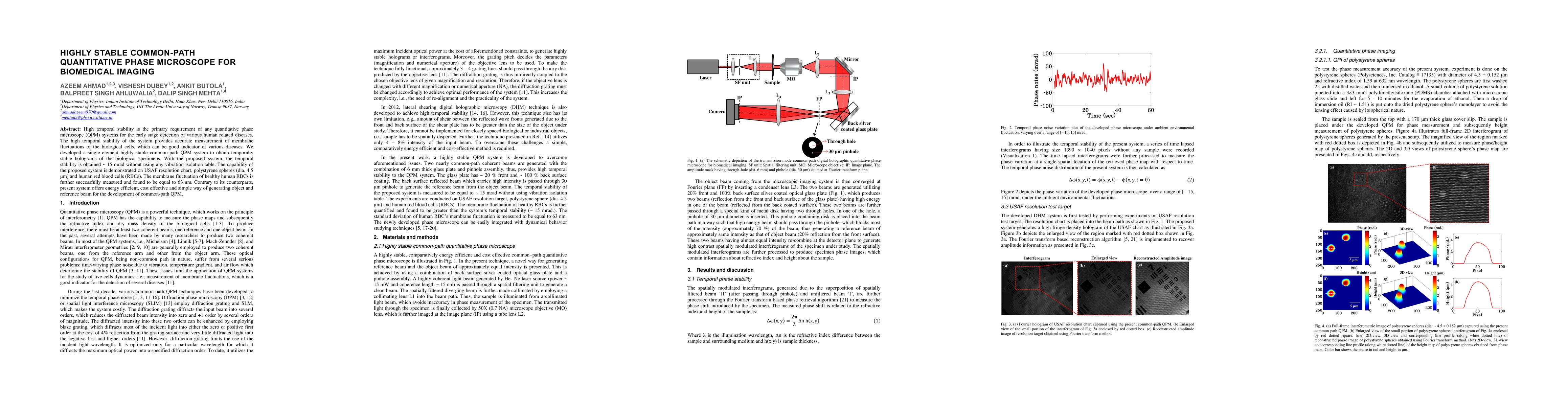 A highly stable common-path quantitative phase microscope was developed for biomedical imaging, achieving temporal stability of ~ 15 mrad without vibration isolation table.