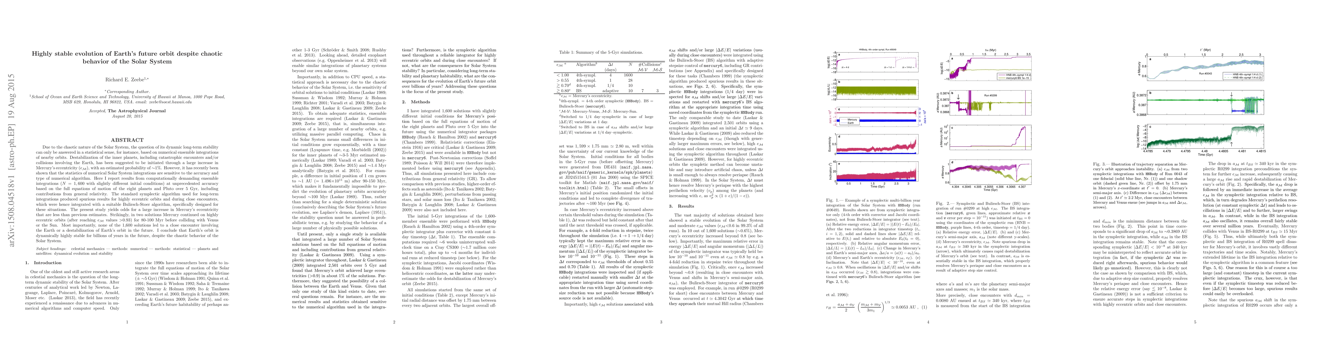 Due to the chaotic nature of the Solar System, the question of its dynamic long-term stability can only be answered in a statistical sense, e.g. based on numerical ensemble integrations of nearby orbits. Destabilization, including catastrophic encounters and/or collisions involving the Earth, has been suggested to be initiated through a large increase in Mercury's eccentricity (eM), with an estimated probability of ~1%. However, it has recently been shown that the statistics of numerical Solar System integrations are sensitive to the accuracy and type of numerical algorithm. Here I report results from computationally demanding ensemble integrations (N=1,600 with slightly different initial conditions) at unprecedented accuracy based on the full equations of motion of the eight planets and Pluto over 5Gyr, including contributions from general relativity. The standard symplectic algorithm produced spurious results for highly eccentric orbits and during close encounters, which were hence integrated with a suitable Bulirsch-Stoer algorithm, specifically designed for these situations. The present study yields odds for a large increase in Mercury's eccentricity that are less than previous estimates. Strikingly, in two solutions Mercury continued on highly eccentric orbits (after reaching eM values >0.93) for 80-100Myr before colliding with Venus or the Sun. Most importantly, none of the 1,600 solutions led to a close encounter involving the Earth or a destabilization of Earth's orbit in the future. I conclude that Earth's orbit is dynamically highly stable for billions of years, despite the chaotic behavior of the Solar System.