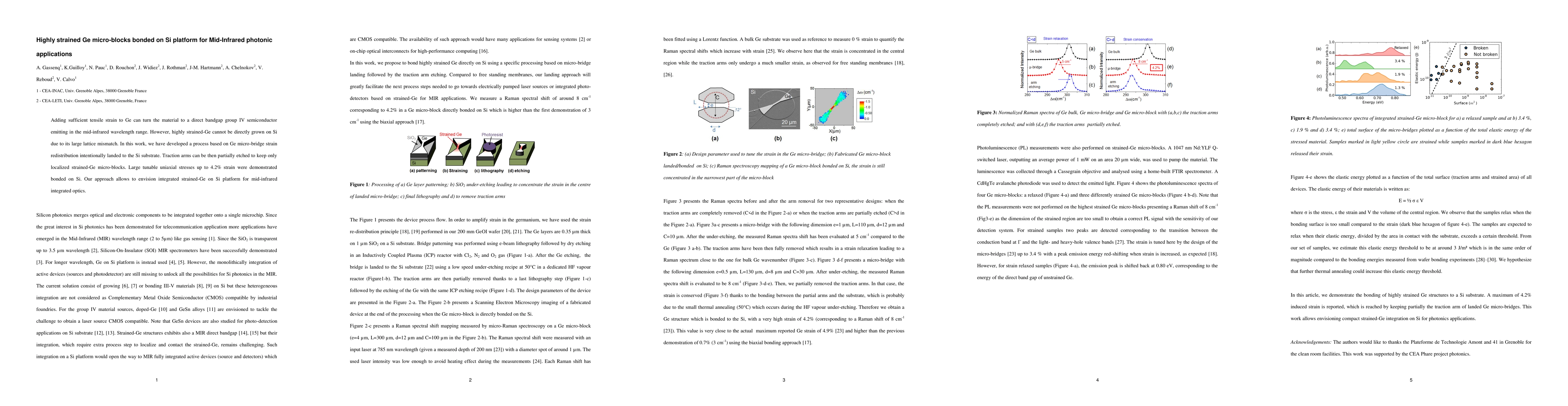 This research develops a method to create highly strained Ge micro-blocks on a Si substrate, enabling mid-infrared photonic applications by overcoming the lattice mismatch issue through strain redistribution. The process allows for up to 4.2% uniaxial strain, paving the way for integrated strained-Ge on Si for mid-infrared optics.