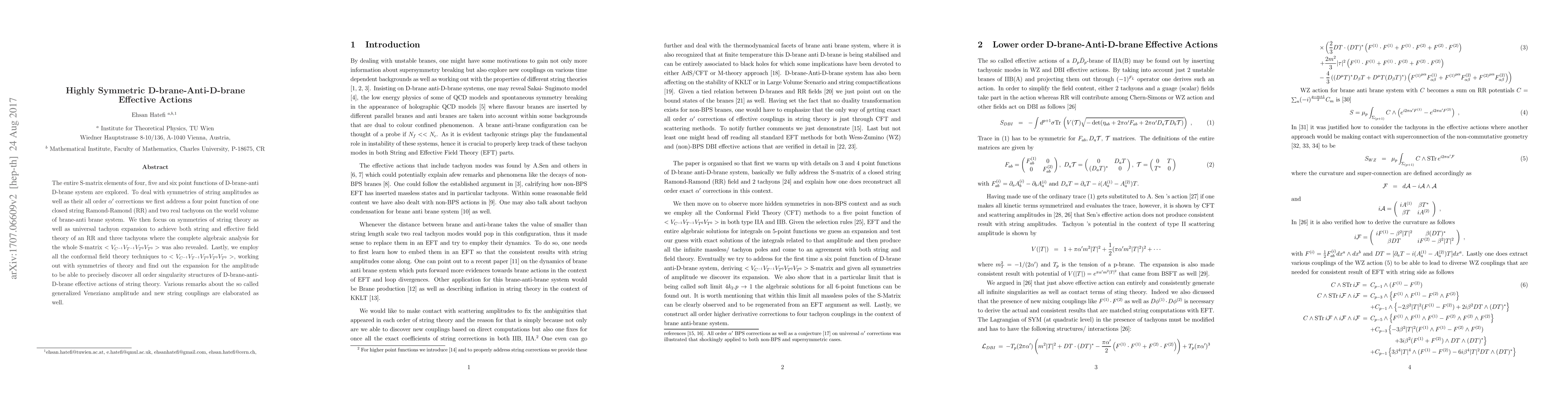 This paper explores the S-matrix elements of D-brane-anti D-brane interactions, focusing on four, five, and six-point functions and their symmetries, including all-order α' corrections. It employs conformal field theory techniques to uncover the complete algebraic structure and singularities of the effective action, along with remarks on generalized Veneziano amplitudes and new string couplings.