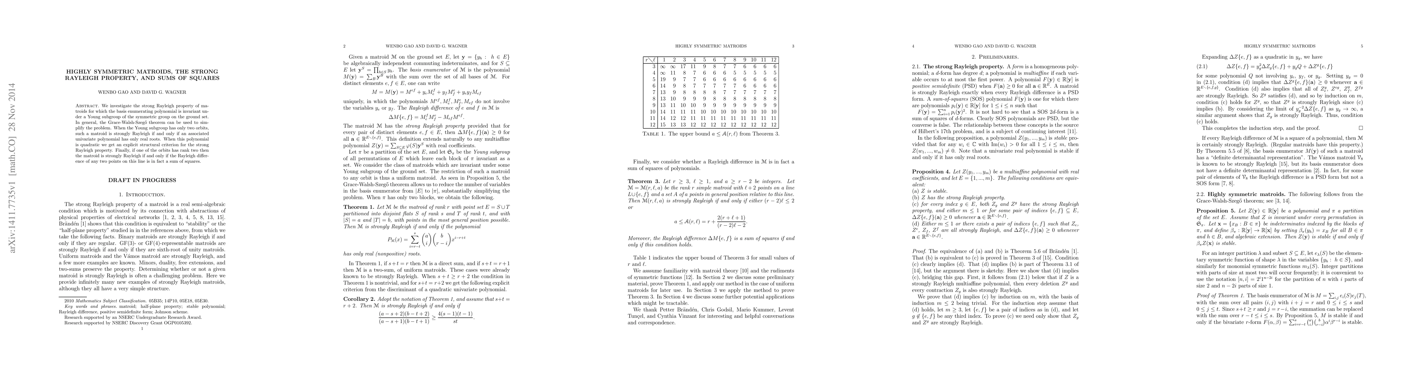 We investigate the strong Rayleigh property of matroids for which the basis enumerating polynomial is invariant under a Young subgroup of the symmetric group on the ground set. In general, the Grace-Walsh-Szeg\H{o} theorem can be used to simplify the problem. When the Young subgroup has only two orbits, such a matroid is strongly Rayleigh if and only if an associated univariate polynomial has only real roots. When this polynomial is quadratic we get an explicit structural criterion for the strong Rayleigh property. Finally, if one of the orbits has rank two then the matroid is strongly Rayleigh if and only if the Rayleigh difference of any two points on this line is in fact a sum of squares.