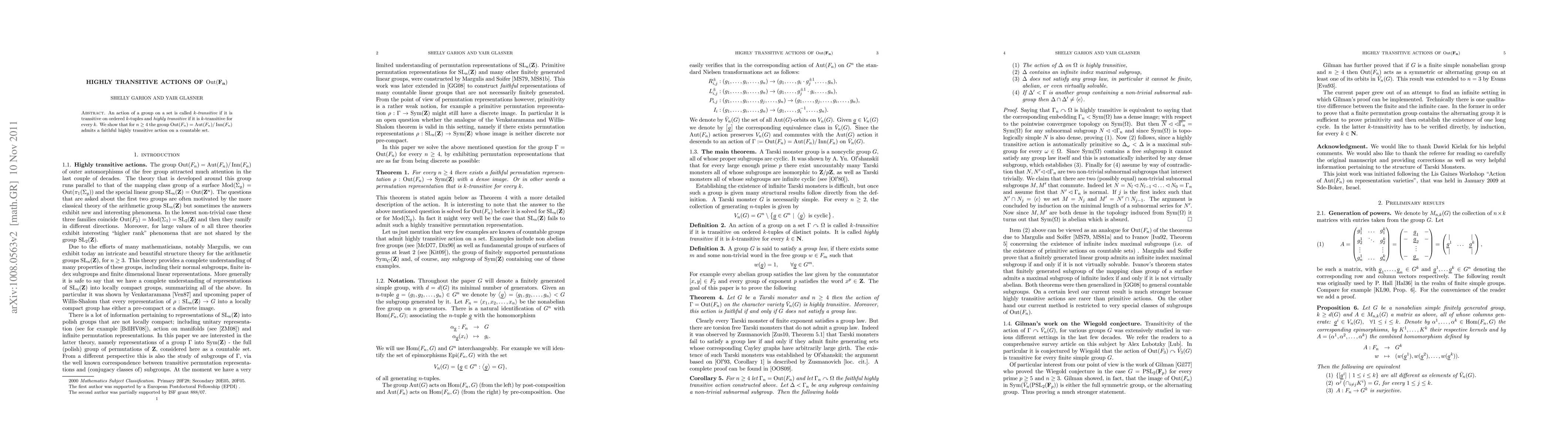 The paper demonstrates that the outer automorphism group Out(Fn) of the free group Fn with n>3 has a faithful highly transitive action on a countable set. This means Out(Fn) can act in a k-transitive manner for every k.