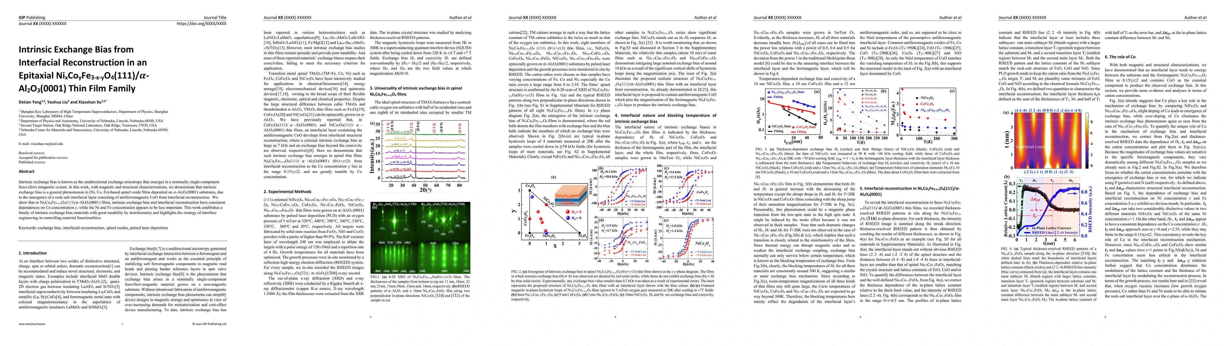 Intrinsic exchange bias up to 12.6 kOe is observed in NixCoyFe3-x-yO4(111)/{\alpha}-Al2O3(0001) (0<=x+y<=3) epitaxial thin films where 0.15<=y<=2. An interfacial layer of rock-salt structure emerges between NixCoyFe3-x-yO4 thin films and {\alpha}-Al2O3 substrates and is proposed as the antiferromagnetic layer unidirectionally coupled with ferrimagnetic NixCoyFe3-x-yO4. In NiCo2O4(111)/{\alpha}-Al2O3(0001) films, results of reflection high energy electron diffraction, X-ray photoelectron spectroscopy, X-ray reflectometry, and polarized neutron reflectometry support that the interfacial layer is antiferromagnetic NixCo1-xO (0.32<=x<=0.49) of rock-salt structure; the interfacial layer and exchange bias can be controlled by growth oxygen pressure revealing the key role of oxygen in the mechanism of the interfacial reconstruction. This work establishes a family of intrinsic exchange bias materials with great tunability by stoichiometry and growth parameters and emphasizes the strategy of interface engineering in controlling material functionalities.