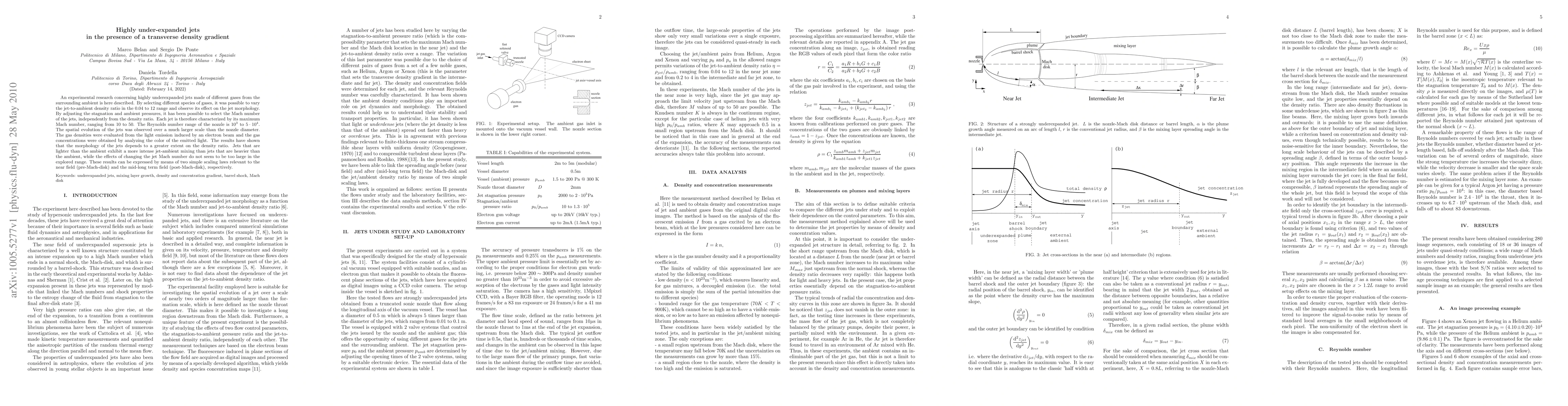 This research experimented with highly underexpanded jets of varying gases, adjusting density ratios from 0.04 to 12 and Mach numbers from 10 to 50. Utilizing light emission from an electron beam and light color analysis, it was found that jet morphology significantly depends on the density ratio, with lighter jets showing more intense mixing. The study presents scaling laws for near and mid-long term jet fields, implying that density ratio has a greater impact on jet behavior than Mach number within the tested range.