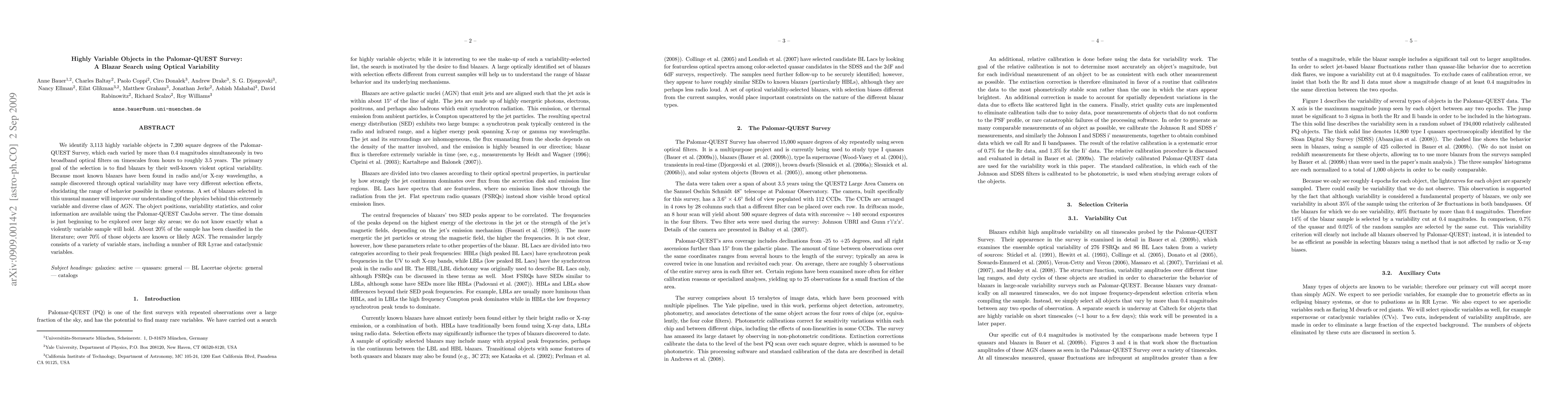 This paper identifies 3,113 highly variable objects in the Palomar-QUEST Survey using optical variability, aiming to discover blazars. The study highlights the potential for uncovering diverse behaviors in AGN through optical selection, contrasting with traditional radio and X-ray methods.