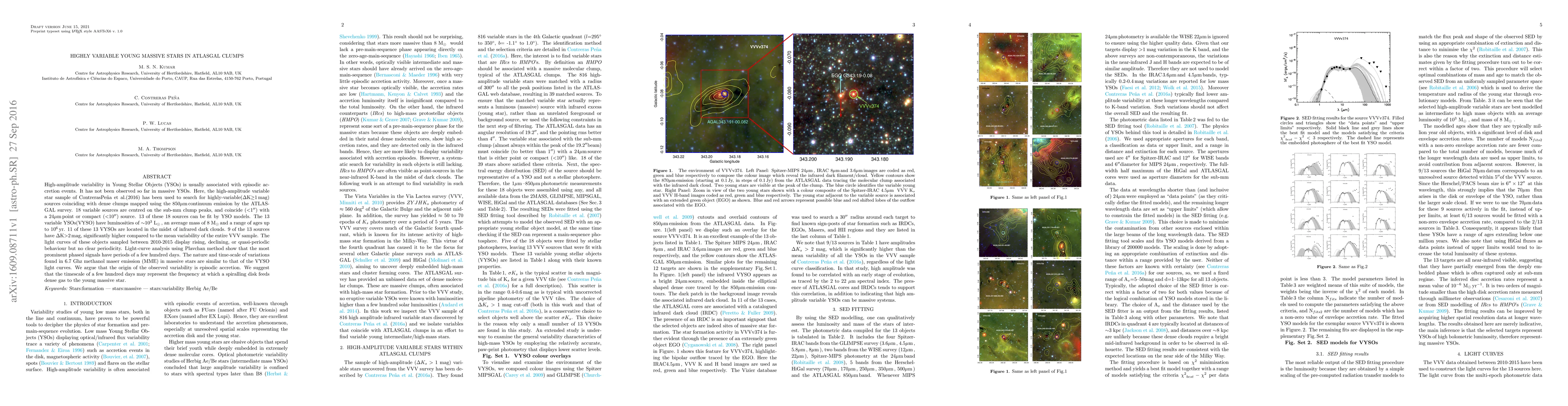 High-amplitude variability in Young Stellar Objects (YSOs) is usually associated with episodic accretion events. It has not been observed so far in massive YSOs. Here, the high-amplitude variable star sample of ContrerasPe\~{n}a et al.(2016) has been used to search for highly-variable($\Delta$K$\ge$1\,mag) sources coinciding with dense clumps mapped using the 850\mum continuum emission by the ATLASGAL survey. 18 variable sources are centred on the sub-mm clump peaks, and coincide ($<$1") with a 24$\mu$m point or compact ($<$10") source. 13 of these 18 sources can be fit by YSO models. The 13 variable YSOs(VYSO) have luminosities of $\sim$10$^3$ L$_{\odot}$, an average mass of 8 M$_{\odot}$ and a range of ages up to 10$^6$ yr. 11 of these 13 VYSOs are located in the midst of infrared dark clouds. 9 of the 13 sources have $\Delta$K$>$2 mag, significantly higher compared to the mean variability of the entire VVV sample. The light curves of these objects sampled between 2010-2015 display rising, declining, or quasi-periodic behaviour but no clear periodicity. Light-curve analysis using Plavchan method show that the most prominent phased signals have periods of a few hundred days. The nature and time-scale of variations found in 6.7 Ghz methanol maser emission (MME) in massive stars are similar to that of the VYSO light curves. We argue that the origin of the observed variability is episodic accretion. We suggest that the timescale of a few hundred days may represent the frequency at which a spiralling disk feeds dense gas to the young massive star.