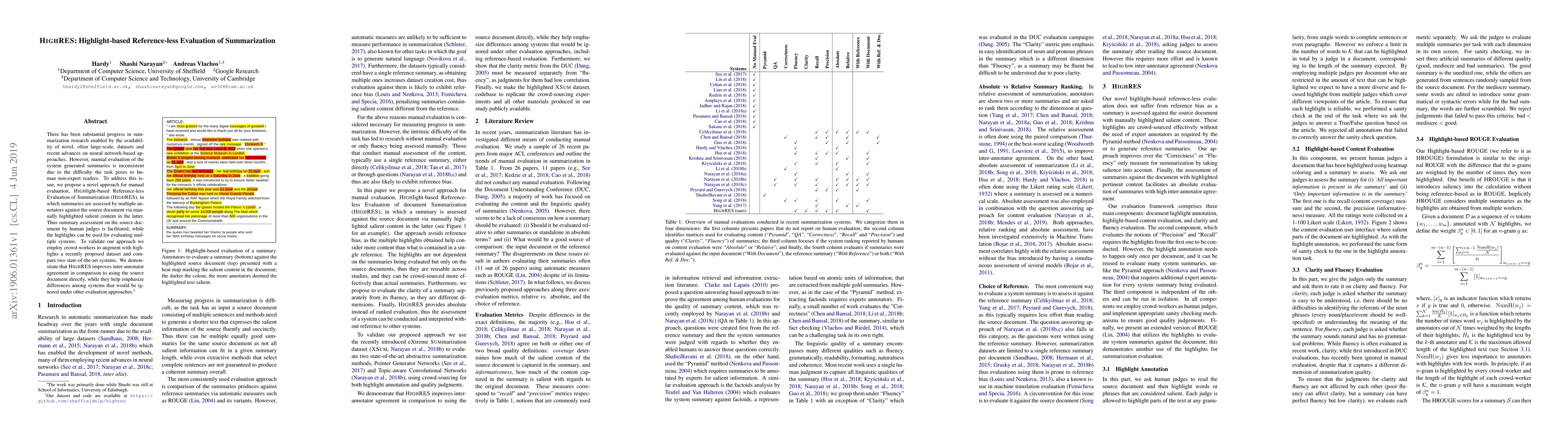 A new evaluation method for summarization systems is proposed, using manually highlighted salient content to facilitate inter-annotator agreement and highlight differences among systems. This approach improves on traditional methods and demonstrates its effectiveness in a recent dataset comparison.